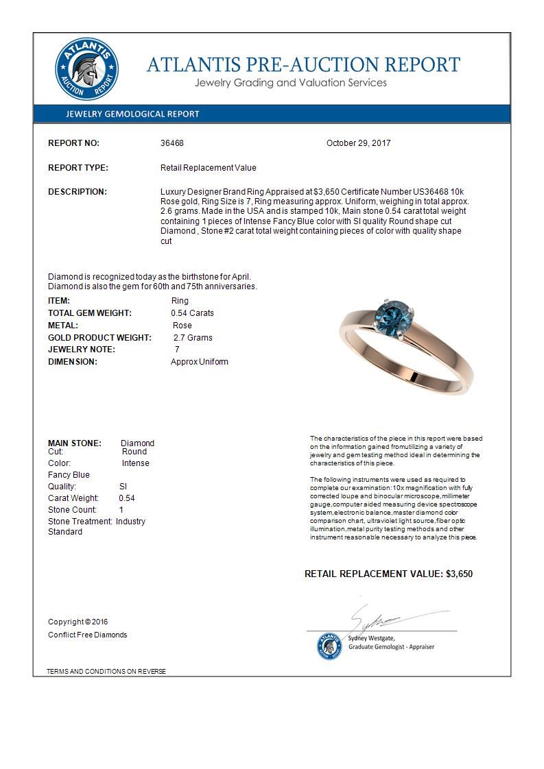 36468 - REF-50N3A ---- 0.54 CTW Certified Intense Blue SI Diamond Solitaire Engagement Ring 10K Rose Gold ---- Luxury Designer Brand Ring Appraised at $3,650 Certificate Number US36468 10k Rose gold, Ring Size is 7, Ring measuring approx. Uniform, weighing in total approx. 2.6 grams. Made in the USA and is stamped 10k, Main stone 0.54 carat total weight containing 1 pieces of Intense Fancy Blue color with SI quality Round shape cut Diamond , Stone #2 carat total weight containing pieces of color with quality shape cut