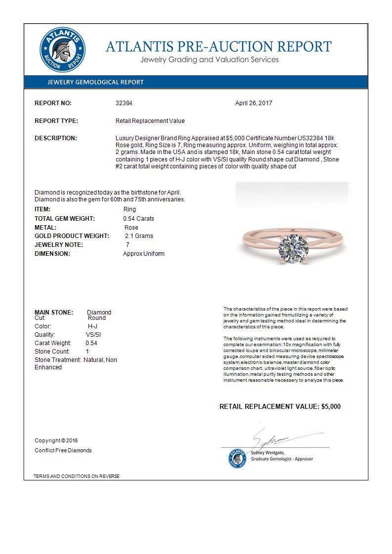0.54 CTW VS/SI Diamond Engagement Designer Ring 18K Rose Gold ---- Luxury Designer Brand Ring Appraised Retail Price at $5,000 ---- SKU Number US32384 18k Rose gold Ring Size is 7, Ring measuring approx. Uniform, weighing in total approx. 2 grams. Made in the USA and is stamped 18k, Main stone 0.54 carat total weight containing 1 pieces of H-J color with VS/SI quality Round shape cut Diamond , Stone #2 carat total weight containing pieces of color with quality shape cut