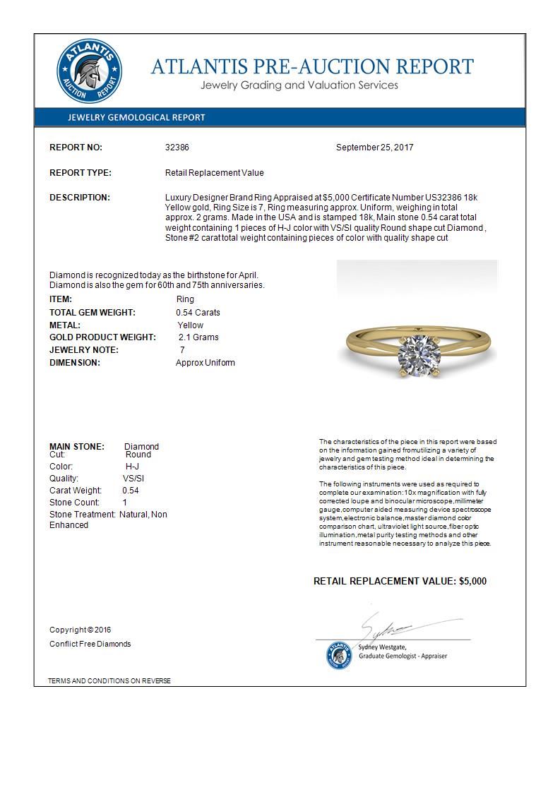 32386 - REF-100M7F ---- 0.54 CTW VS/SI Diamond Engagement Designer Ring 18K Yellow Gold ---- Luxury Designer Brand Ring Appraised at $5,000 Certificate Number US32386 18k Yellow gold, Ring Size is 7, Ring measuring approx. Uniform, weighing in total approx. 2 grams. Made in the USA and is stamped 18k, Main stone 0.54 carat total weight containing 1 pieces of H-J color with VS/SI quality Round shape cut Diamond , Stone #2 carat total weight containing pieces of color with quality shape cut