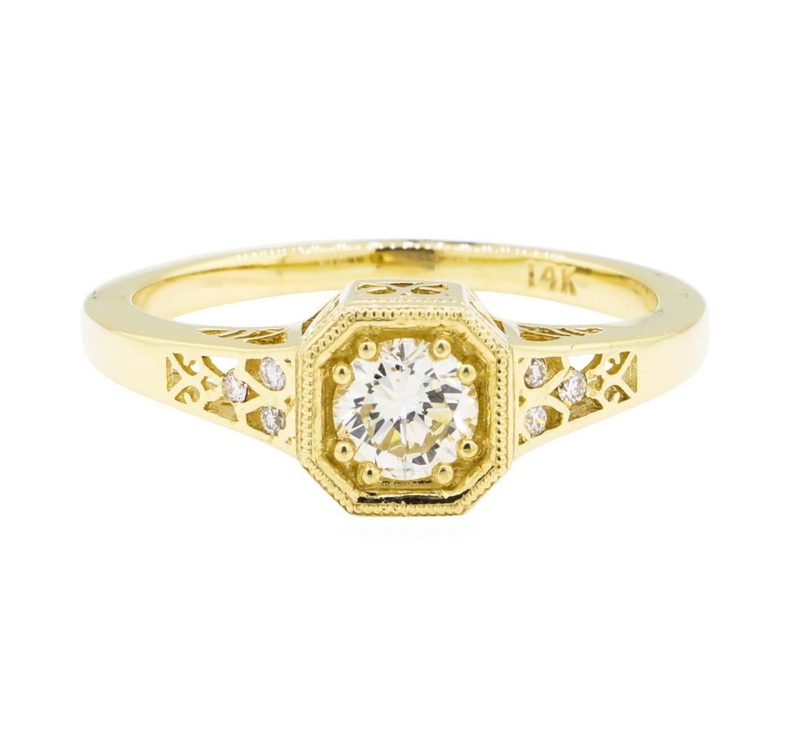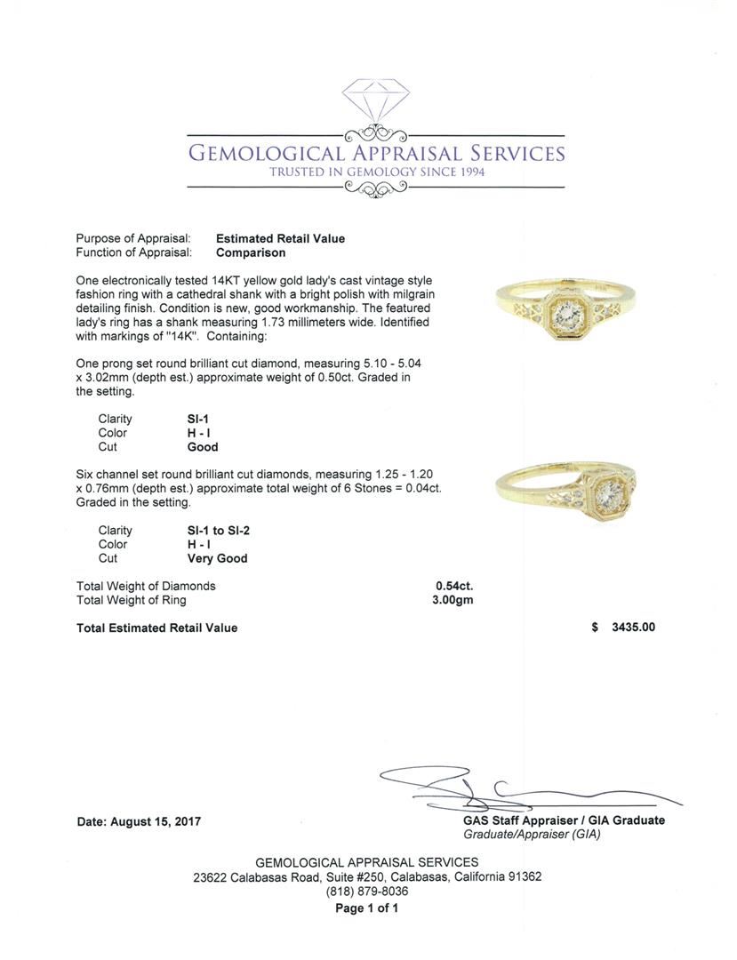 One electronically tested 14KT yellow gold lady's cast vintage style fashion ring with a cathedral shank with a bright polish with milgrain detailing finish. The featured lady's ring has a shank measuring 1.73 millimeters wide. Identified with markings of '14K'. Condition is new, good workmanship. Containing: One prong set round brilliant cut diamond, measuring 5.10 - 5.04 x 3.02mm (depth est.) approximate weight of 0.50ct. Graded in the setting. Color H - I Clarity SI-1 Cut Good Six channel set round brilliant cut diamonds, measuring 1.25 - 1.20 x 0.76mm (depth est.) approximate total weight of 6 Stones = 0.04ct. Graded in the setting. Color H - I Clarity SI-1 to SI-2 Cut Very Good. Total Weight of Diamonds 0.54ct.. Total Weight of Ring 3.00gm GAS Appraised at $3435.00. GAS Appraised at $3,435.00.