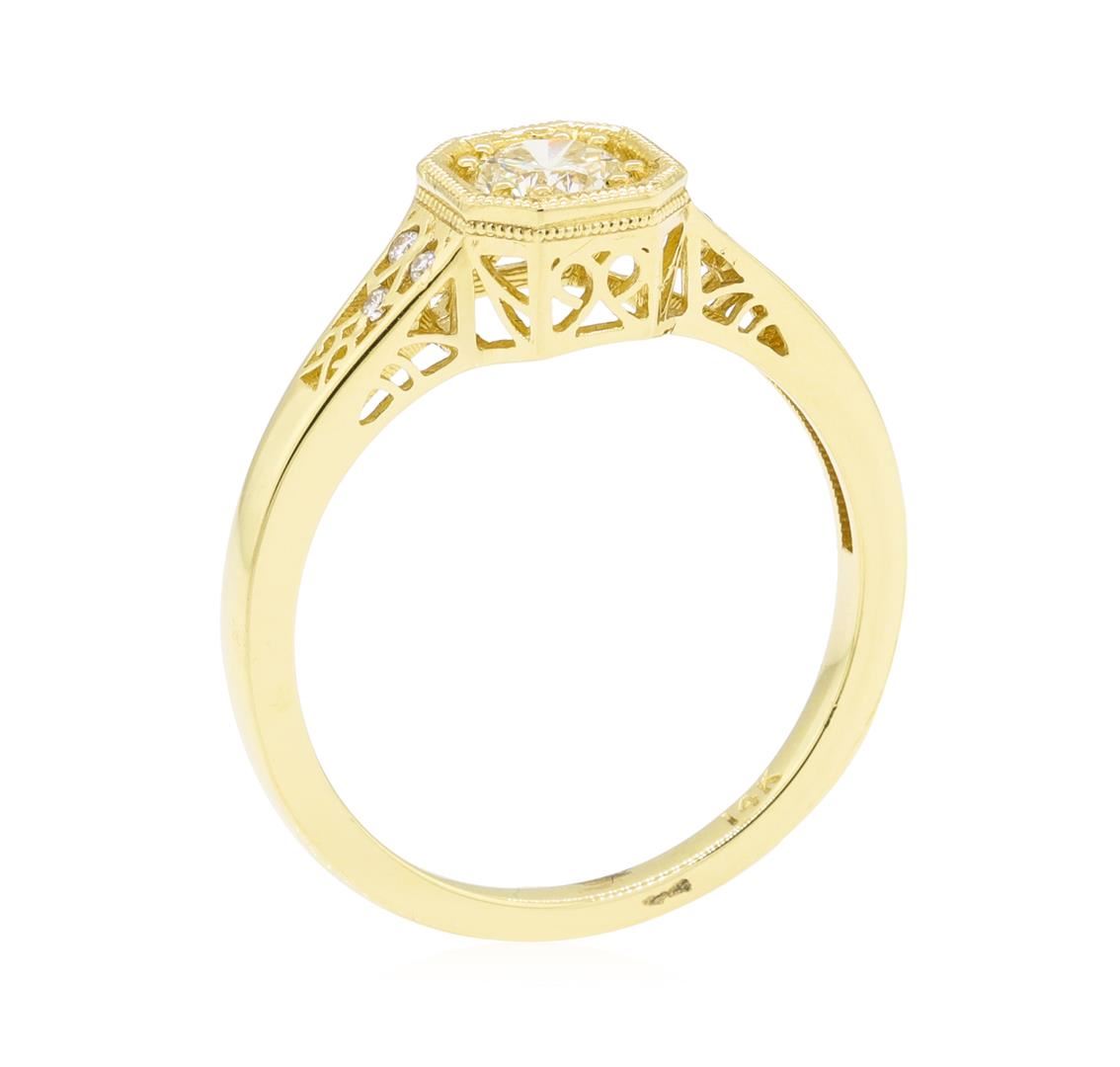 One electronically tested 14KT yellow gold lady's cast vintage style fashion ring with a cathedral shank with a bright polish with milgrain detailing finish. The featured lady's ring has a shank measuring 1.73 millimeters wide. Identified with markings of '14K'. Condition is new, good workmanship. Containing: One prong set round brilliant cut diamond, measuring 5.10 - 5.04 x 3.02mm (depth est.) approximate weight of 0.50ct. Graded in the setting. Color H - I Clarity SI-1 Cut Good Six channel set round brilliant cut diamonds, measuring 1.25 - 1.20 x 0.76mm (depth est.) approximate total weight of 6 Stones = 0.04ct. Graded in the setting. Color H - I Clarity SI-1 to SI-2 Cut Very Good. Total Weight of Diamonds 0.54ct.. Total Weight of Ring 3.00gm GAS Appraised at $3435.00. GAS Appraised at $3,435.00.