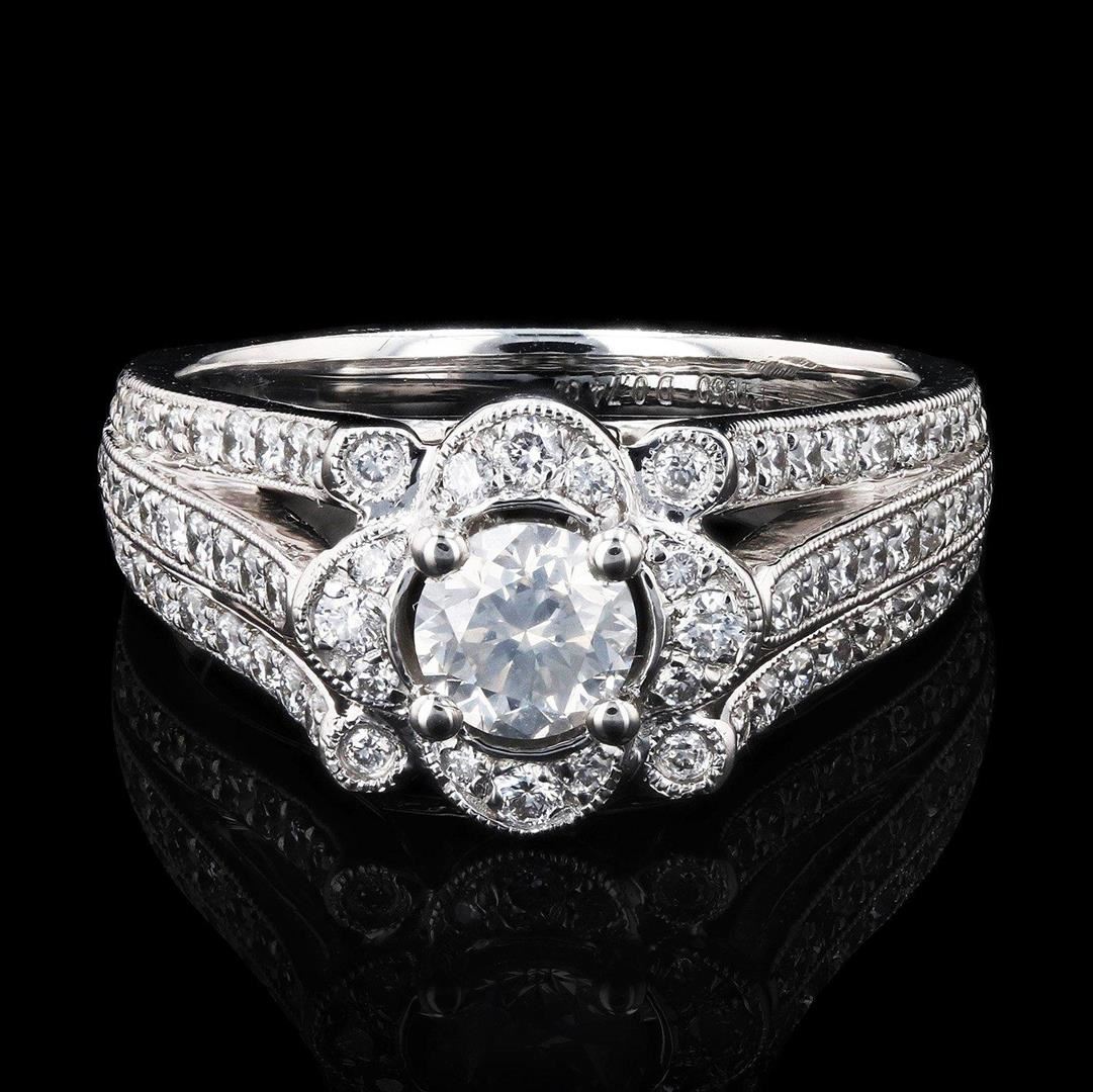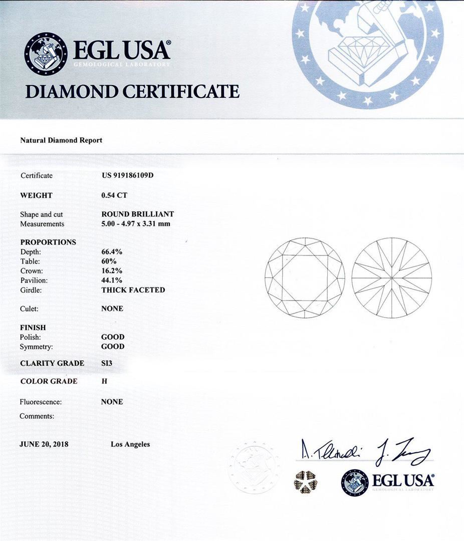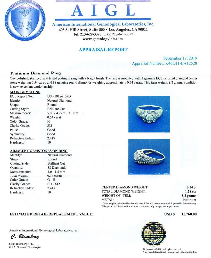 0.54ct SI3 CLARITY CENTER Diamond Platinum Ring (1.28ctw Diamonds) EGL USA CERTIFIED. Platinum Diamond Ring One polished, stamped, and tested platinum ring with a bright finish. The ring is mounted with 1 genuine EGL certified diamond center stone weighing 0.54 carat, and 88 genuine round diamonds weighing approximately 0.74 carats. This item weighs 8.8 grams, condition is new, excellent workmanship. MAIN GEMSTONE EGL Report No.: US 919186109D Identity: Natural Diamond Shape: Round Cutting Style: Brilliant Cut Measurements: 5.00 - 4.97 x 3.31mm Weight: 0.54 carat Color Grade: H Clarity Grade: SI3 Polish: Good Symmetry: Good Refractive Index: 2.417 Hardness: 10 ADJACENT GEMSTONES ON RING Identity: Natural Diamond Shape: Round Cutting Style: Brilliant Cut Quantity: 88 Diamonds Measurements: 1.0 - 1.5mm Total Weight: 0.74 Carats Color Grade: G - H Clarity Grade: SI1 to SI2 Refractive Index: 2.418 Hardness: 10 CENTER DIAMOND WEIGHT: 0.54ct TOTAL DIAMOND WEIGHT: 1.28ctw WEIGHT OF ITEM: 8.8 grams METAL: Platinum