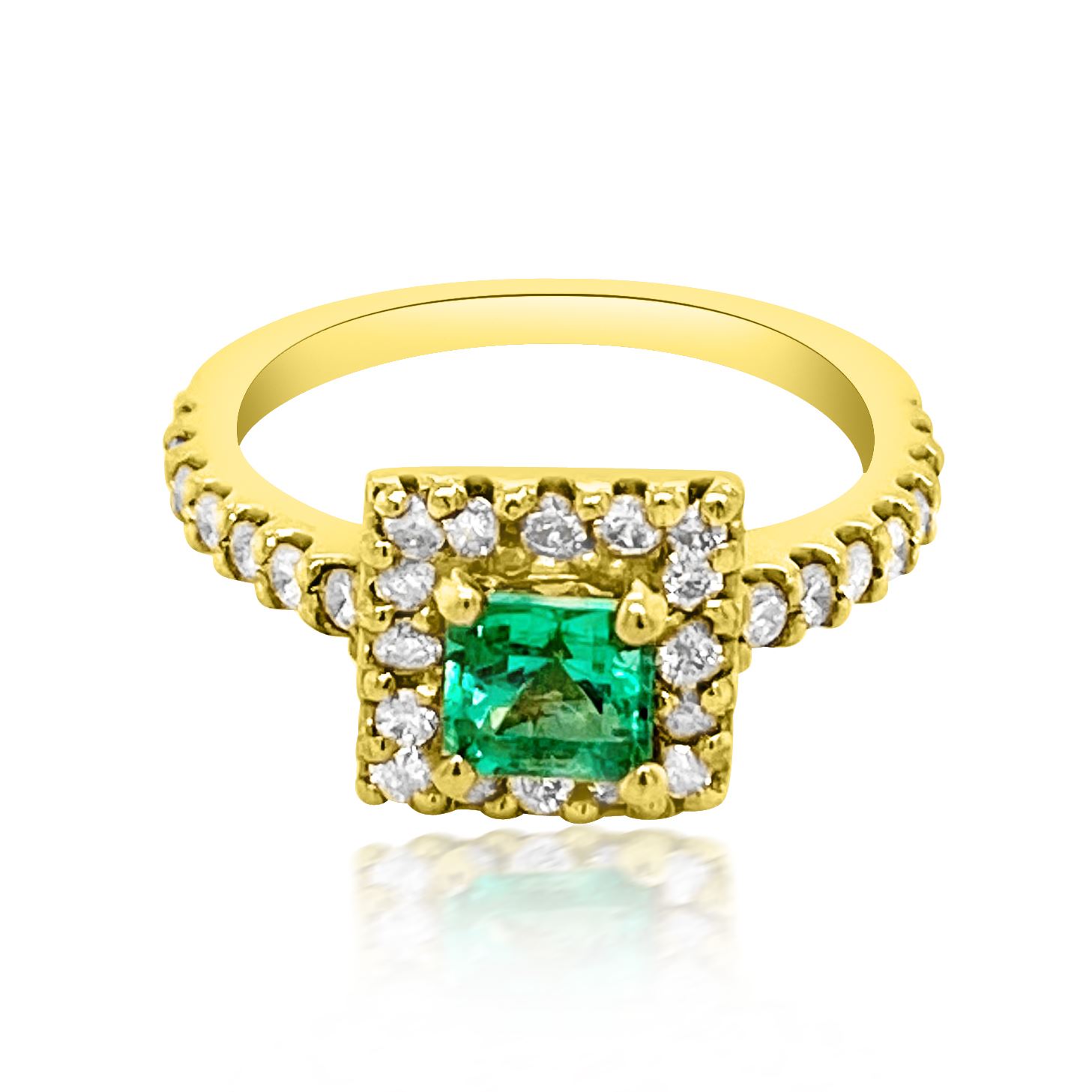 14K YELLOW GOLD NATURAL COLOMBIAN EMERALD RING:2.85 GRAMS/DIAMOND:0.62CT/EMERALD:0.54CT/#GVR1061 **The light plays across this stunning 0.54ct Emerald cut fine Colombian Emerald, a stone known to help one act and live from the heart level, and it sparkles like a pristine mountain lake. Encircled by 0.62ct round cut Diamonds and mounted in 14kt yellow gold, this ring is an investment piece; it will catch your eye and capture your imagination.**
