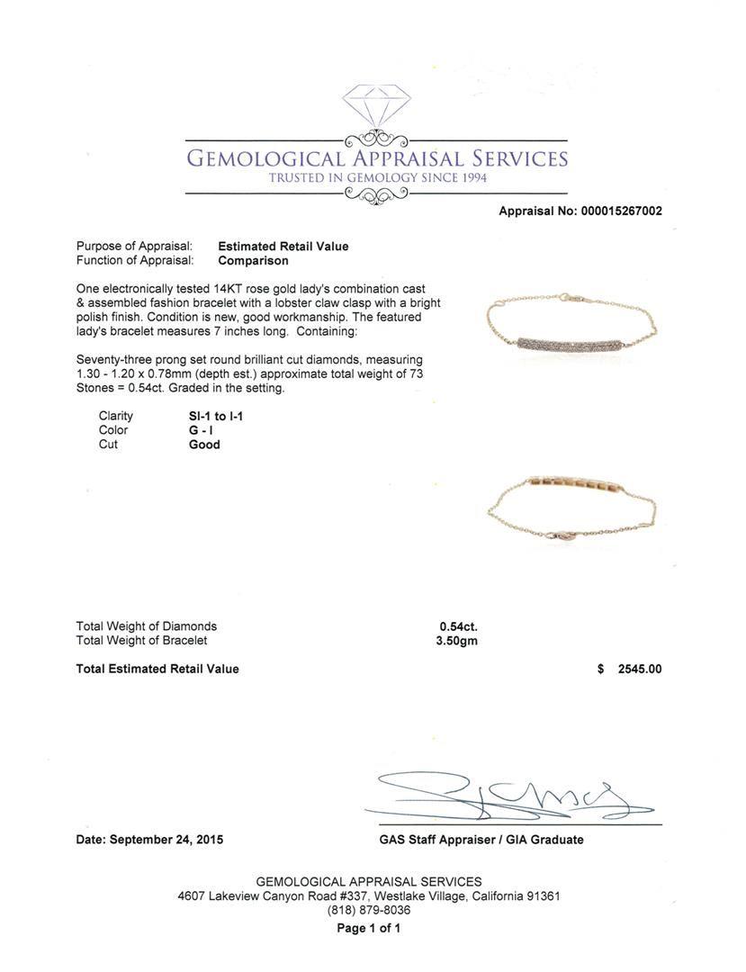 One electronically tested 14KT rose gold lady's combination cast & assembled fashion bracelet with a lobster claw clasp with a bright polish finish. The featured lady's bracelet measures 7 inches long. Condition is new, good workmanship. Containing: Seventy-Three prong set round brilliant cut diamonds, measuring 1.30 - 1.20 x 0.78mm (depth est.) approximate total weight of 73 Stones = 0.54ct. Graded in the setting. Clarity: SI-1 to I-1. Color: G - I. Cut Good. Total Weight of Diamonds 0.54ct. Total Weight of Bracelet 3.50gm at $2545.00.. GAS Appraised at $2,545.00.