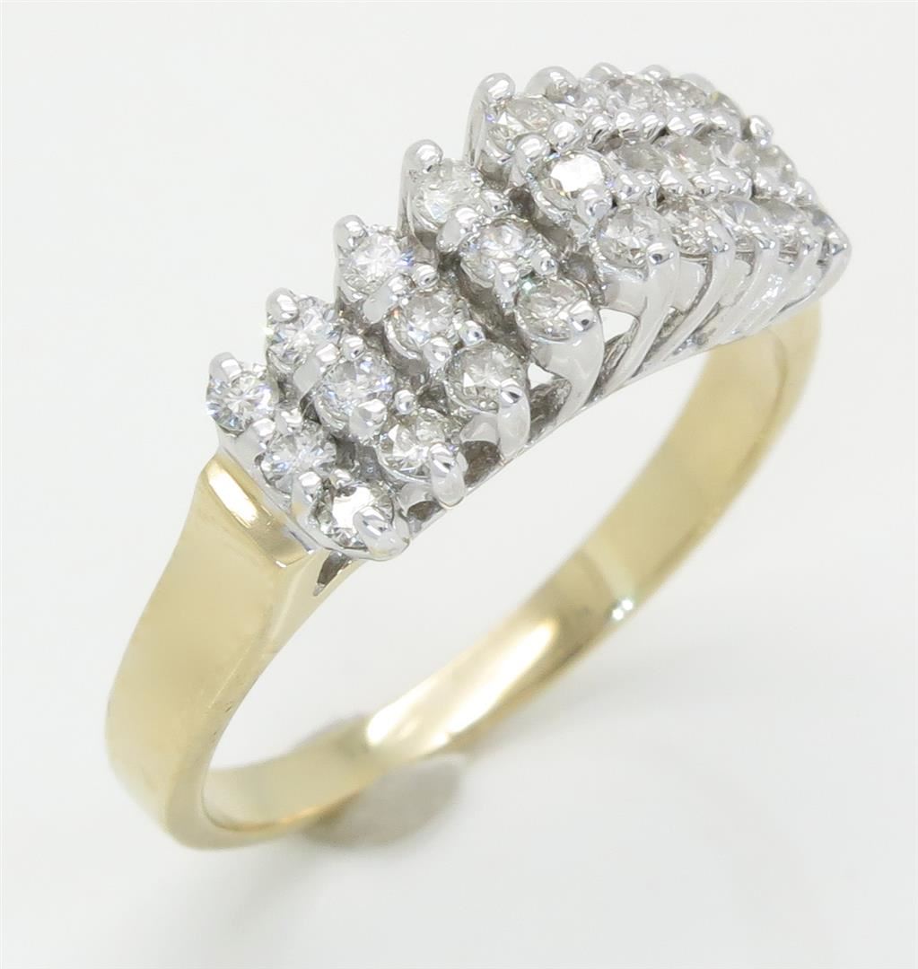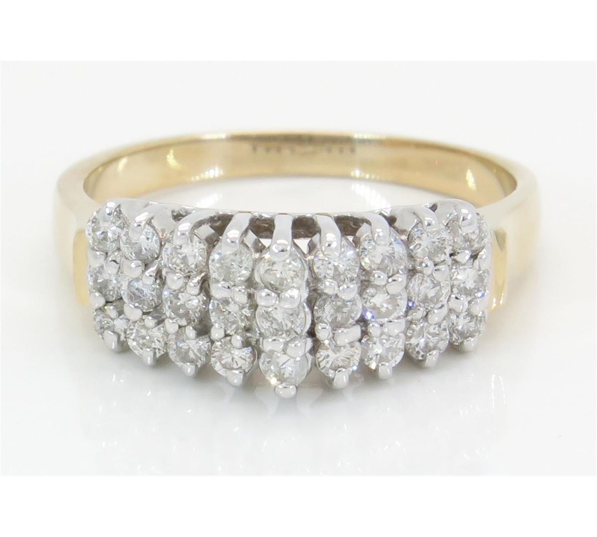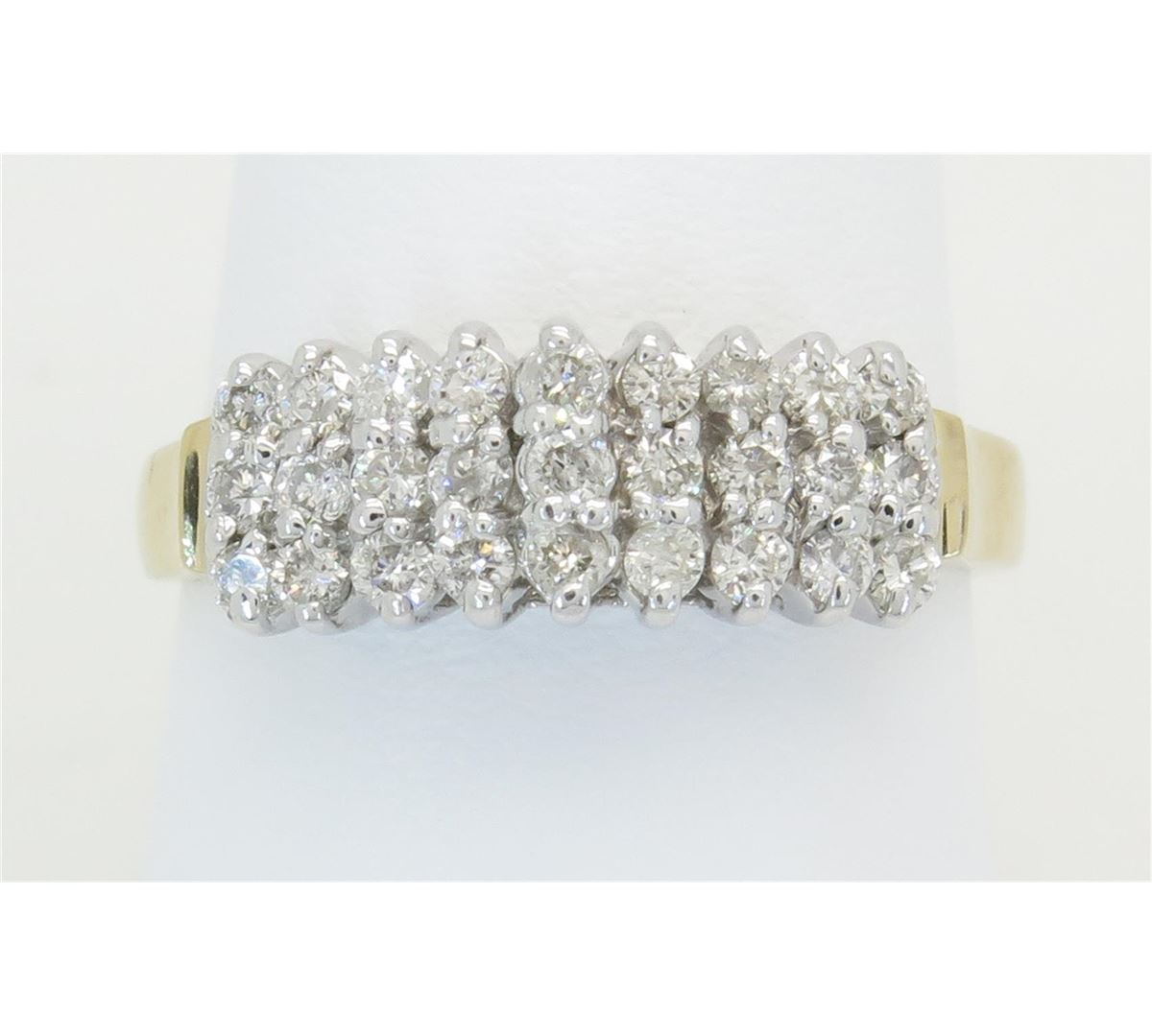 One tested 14K yellow gold diamond ring. Containing: 27 Round Brilliant Cut Diamonds. Clarity: I, Color: G-I. Approximate total diamond weight: .54CTW. Diamonds are graded in the mounting, unless otherwise stated. Weight: 3.4 grams, Size: 6.5.