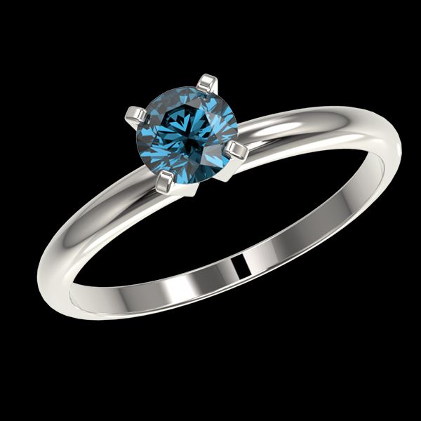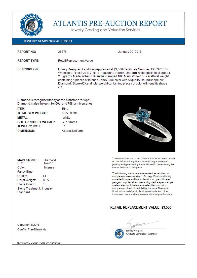 REF-58A2X -36378 ---- 0.55 CTW Certified Intense Blue SI Diamond Solitaire Engagement Ring 10K White Gold ---- Luxury Designer Brand Ring Appraised at $3,500 Certificate Number US36378 10k White gold, Ring Size is 7, Ring measuring approx. Uniform, weighing in total approx. 2.6 grams. Made in the USA and is stamped 10k, Main stone 0.55 carat total weight containing 1 pieces of Intense Fancy Blue color with SI quality Round shape cut Diamond , Stone #2 carat total weight containing pieces of color with quality shape cut
