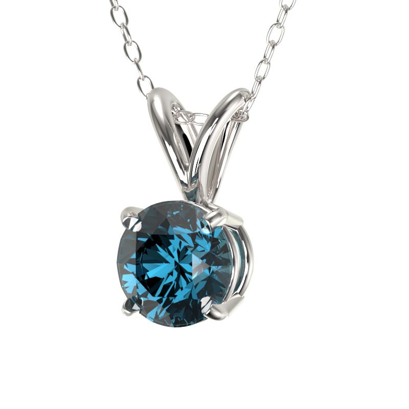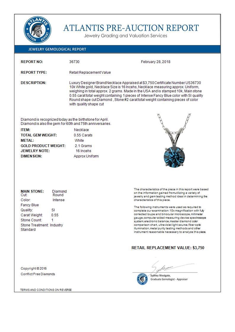 REF-51W2F -36730 ---- 0.55 CTW Certified Intense Blue SI Diamond Solitaire Necklace 10K White Gold ---- Luxury Designer Brand Necklace Appraised at $3,750 Certificate Number US36730 10k White gold, Necklace Size is 16 Incehs, Necklace measuring approx. Uniform, weighing in total approx. 2 grams. Made in the USA and is stamped 10k, Main stone 0.55 carat total weight containing 1 pieces of Intense Fancy Blue color with SI quality Round shape cut Diamond , Stone #2 carat total weight containing pieces of color with quality shape cut
