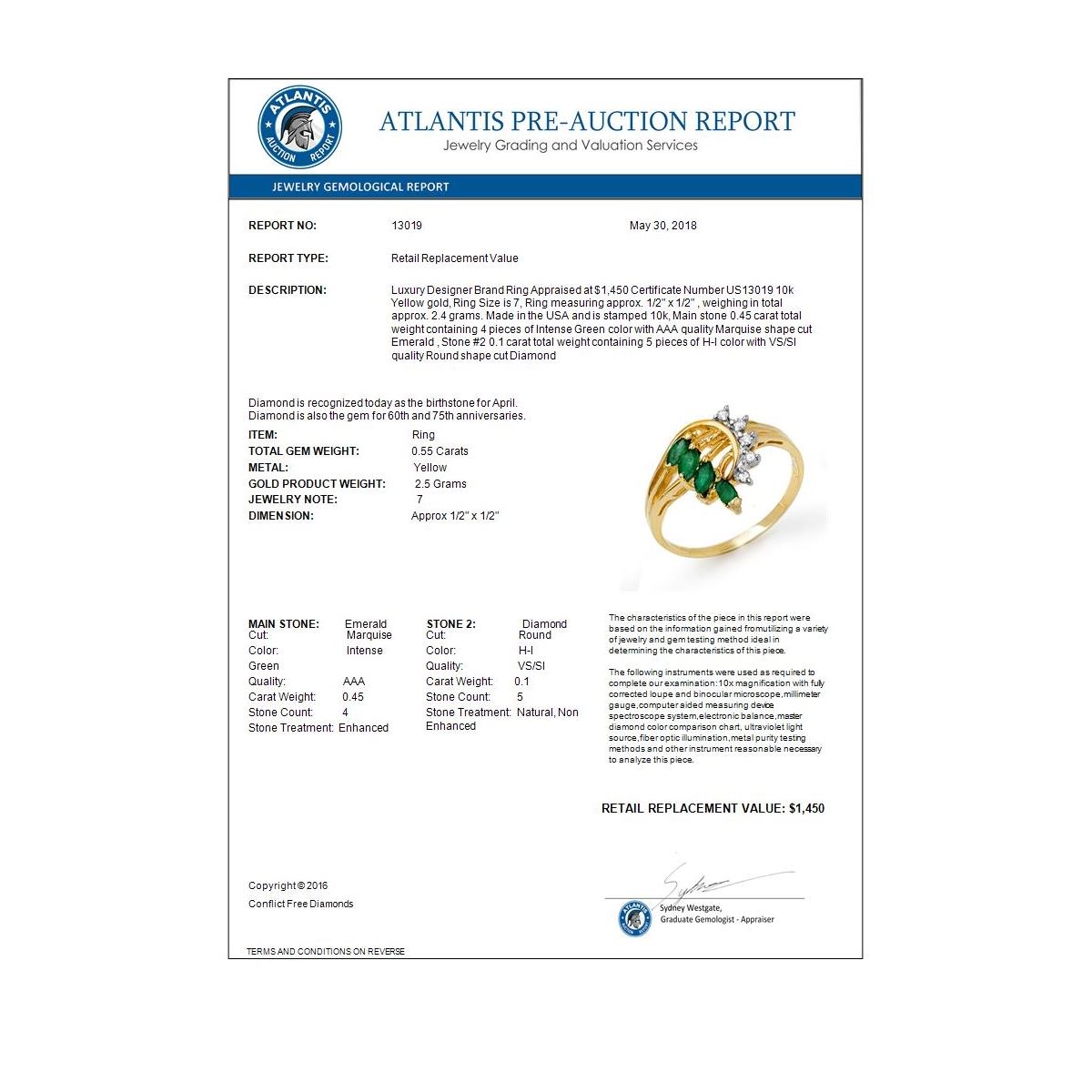 REF-22Y2K -13019 ---- 0.55 CTW Emerald & Diamond Ring 10K Yellow Gold ---- Luxury Designer Brand Ring Appraised at $1,450 Certificate Number US13019 10k Yellow gold, Ring Size is 7, Ring measuring approx. 1/2" x 1/2" , weighing in total approx. 2.4 grams. Made in the USA and is stamped 10k, Main stone 0.45 carat total weight containing 4 pieces of Intense Green color with AAA quality Marquise shape cut Emerald , Stone #2 0.1 carat total weight containing 5 pieces of H-I color with VS/SI quality Round shape cut Diamond