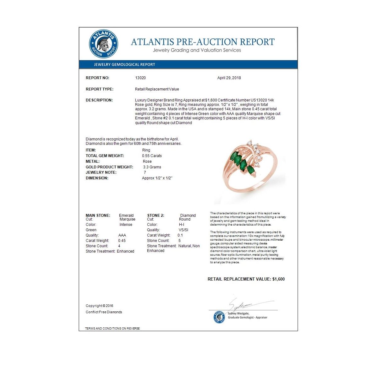 REF-24M5H -13020 ---- 0.55 CTW Emerald & Diamond Ring 14K Rose Gold ---- Luxury Designer Brand Ring Appraised at $1,600 Certificate Number US13020 14k Rose gold, Ring Size is 7, Ring measuring approx. 1/2" x 1/2" , weighing in total approx. 3.2 grams. Made in the USA and is stamped 14k, Main stone 0.45 carat total weight containing 4 pieces of Intense Green color with AAA quality Marquise shape cut Emerald , Stone #2 0.1 carat total weight containing 5 pieces of H-I color with VS/SI quality Round shape cut Diamond
