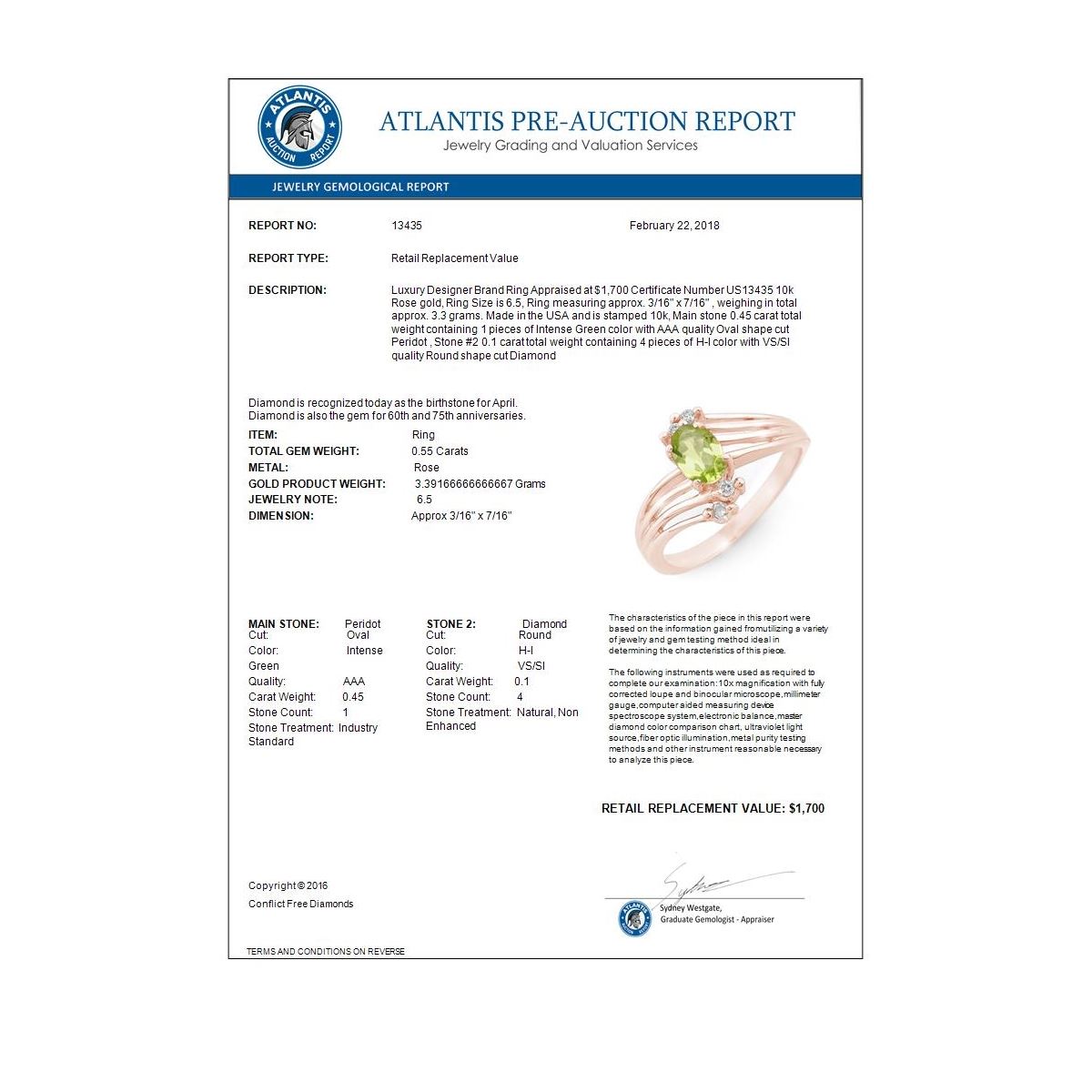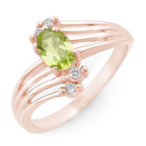 REF-23M6H -13435 ---- 0.55 CTW Peridot & Diamond Ring 10K Rose Gold ---- Luxury Designer Brand Ring Appraised at $1,700 Certificate Number US13435 10k Rose gold, Ring Size is 6.5, Ring measuring approx. 3/16" x 7/16" , weighing in total approx. 3.3 grams. Made in the USA and is stamped 10k, Main stone 0.45 carat total weight containing 1 pieces of Intense Green color with AAA quality Oval shape cut Peridot , Stone #2 0.1 carat total weight containing 4 pieces of H-I color with VS/SI quality Round shape cut Diamond