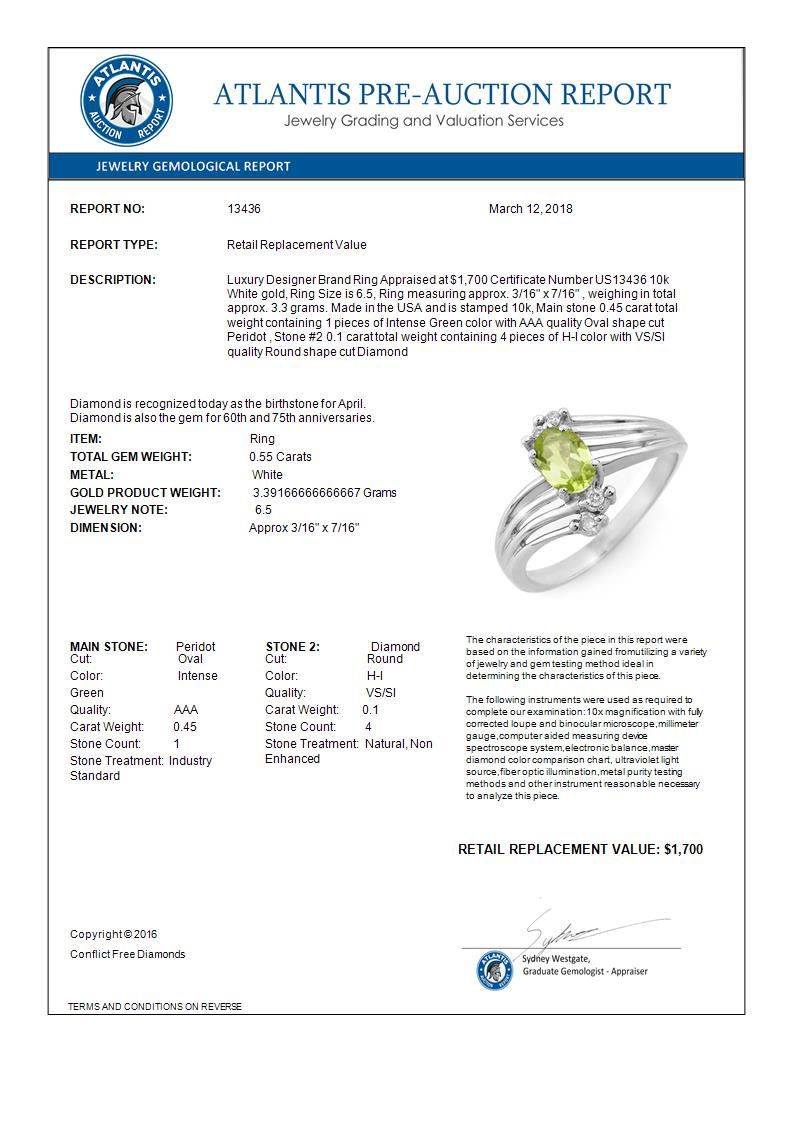 REF-23Y6K -13436 ---- 0.55 CTW Peridot & Diamond Ring 10K White Gold ---- Luxury Designer Brand Ring Appraised at $1,700 Certificate Number US13436 10k White gold, Ring Size is 6.5, Ring measuring approx. 3/16" x 7/16" , weighing in total approx. 3.3 grams. Made in the USA and is stamped 10k, Main stone 0.45 carat total weight containing 1 pieces of Intense Green color with AAA quality Oval shape cut Peridot , Stone #2 0.1 carat total weight containing 4 pieces of H-I color with VS/SI quality Round shape cut Diamond