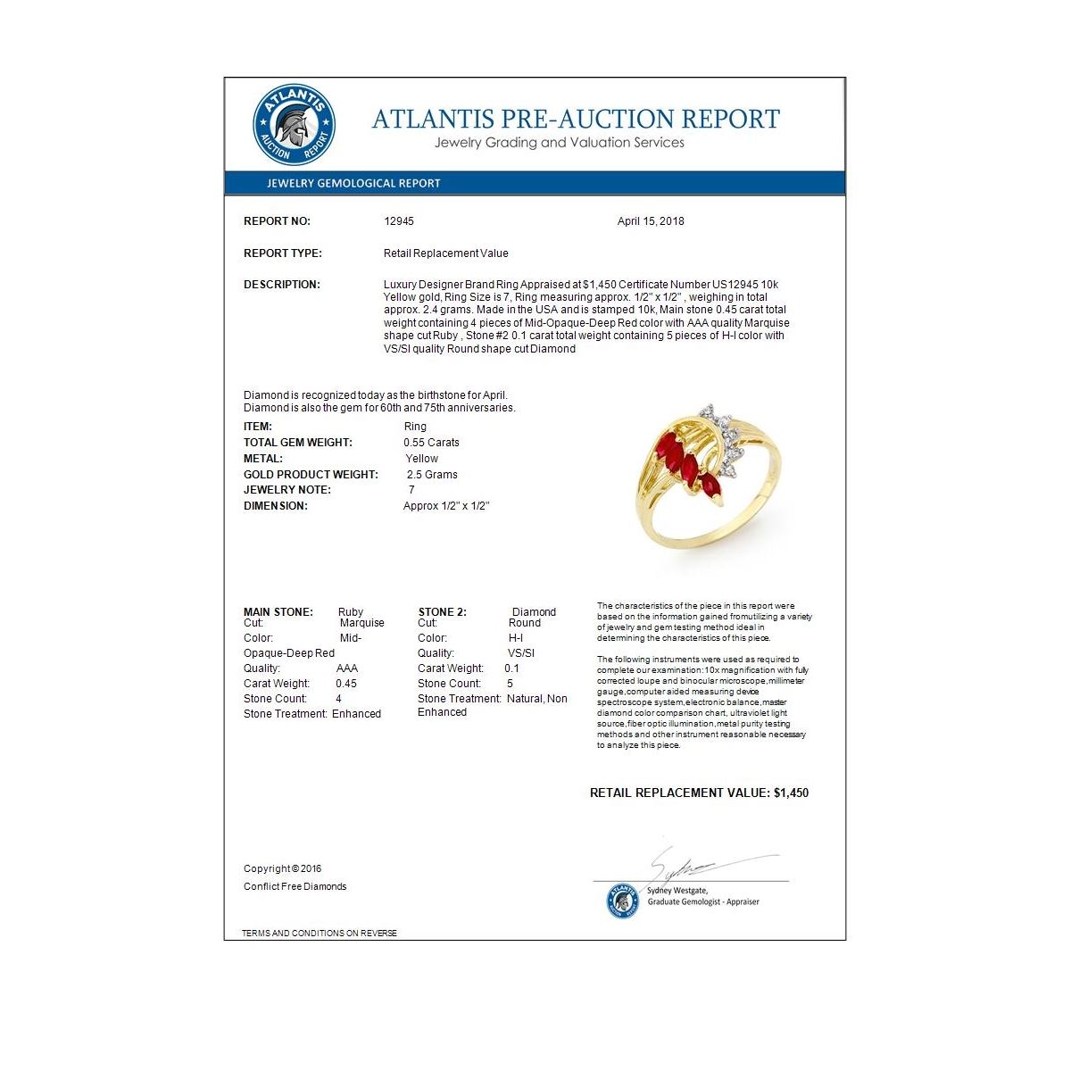 REF-22T2M -12945 ---- 0.55 CTW Ruby & Diamond Ring 10K Yellow Gold ---- Luxury Designer Brand Ring Appraised at $1,450 Certificate Number US12945 10k Yellow gold, Ring Size is 7, Ring measuring approx. 1/2" x 1/2" , weighing in total approx. 2.4 grams. Made in the USA and is stamped 10k, Main stone 0.45 carat total weight containing 4 pieces of Mid-Opaque-Deep Red color with AAA quality Marquise shape cut Ruby , Stone #2 0.1 carat total weight containing 5 pieces of H-I color with VS/SI quality Round shape cut Diamond