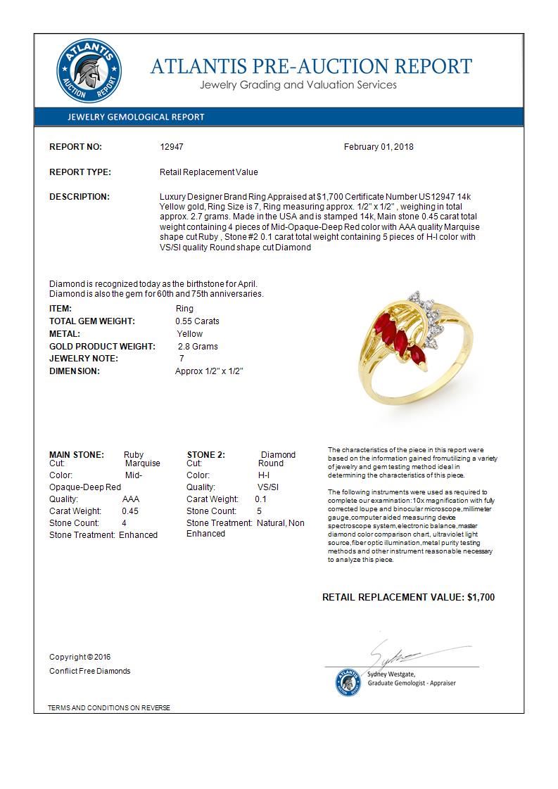 REF-26T2M -12947 ---- 0.55 CTW Ruby & Diamond Ring 14K Yellow Gold ---- Luxury Designer Brand Ring Appraised at $1,700 Certificate Number US12947 14k Yellow gold, Ring Size is 7, Ring measuring approx. 1/2" x 1/2" , weighing in total approx. 2.7 grams. Made in the USA and is stamped 14k, Main stone 0.45 carat total weight containing 4 pieces of Mid-Opaque-Deep Red color with AAA quality Marquise shape cut Ruby , Stone #2 0.1 carat total weight containing 5 pieces of H-I color with VS/SI quality Round shape cut Diamond