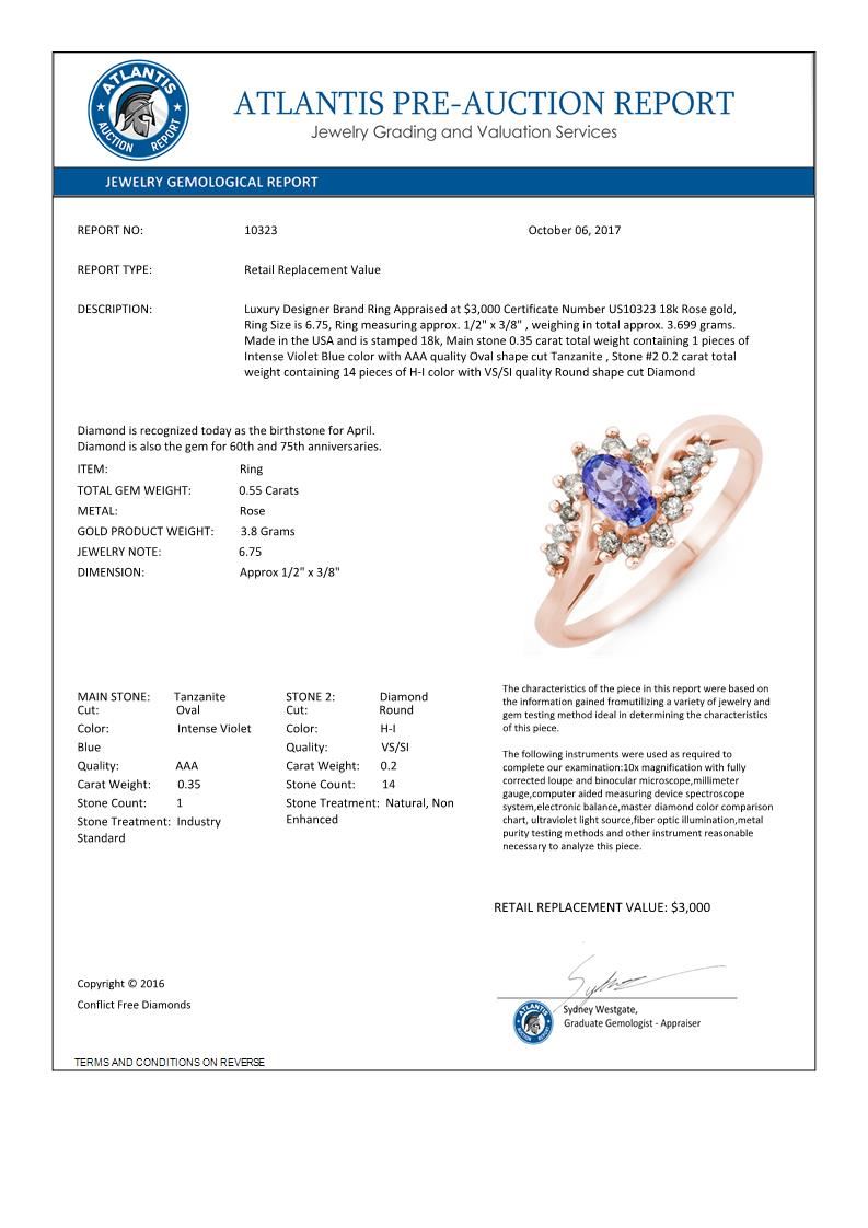 10323 - REF-41M8F ---- 0.55 CTW Tanzanite & Diamond Ring 18K Rose Gold ---- Luxury Designer Brand Ring Appraised at $3,000 Certificate Number US10323 18k Rose gold, Ring Size is 6.75, Ring measuring approx. 1/2" x 3/8" , weighing in total approx. 3.699 grams. Made in the USA and is stamped 18k, Main stone 0.35 carat total weight containing 1 pieces of Intense Violet Blue color with AAA quality Oval shape cut Tanzanite , Stone #2 0.2 carat total weight containing 14 pieces of H-I color with VS/SI quality Round shape cut Diamond