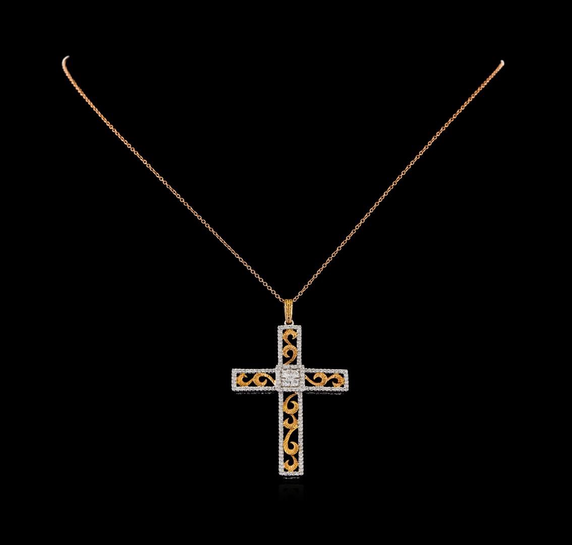 One cross pendant with chain featuring: 18KT white and rose gold weighing 6.95 grams and diamonds weighing 0.55ctw.
