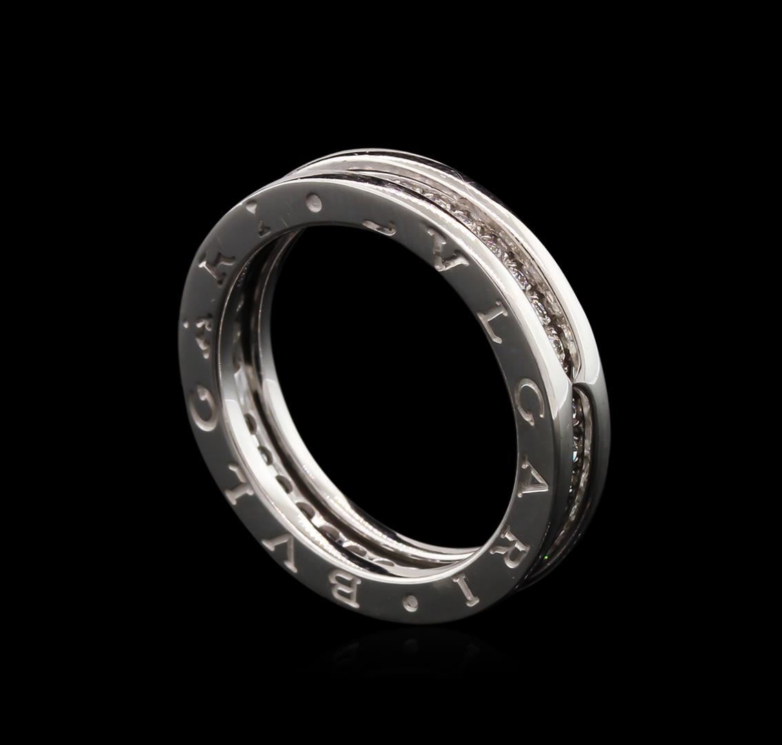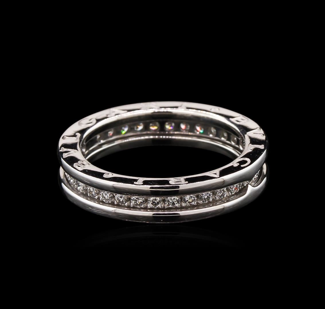 One stamped & tested 18KT white gold lady's combination cast & assembled eternity ring with a bright polish finish. The featured Bulgari ring is a B.zero1 1-band ring and has a shank measuring 4.60 millimeters in width. Serial number 2337AL. Trademark is Bulgari. Identified with markings of "750". Condition is used, very good. Containing: Thirty-Four split prong set round brilliant cut diamonds, measuring 1.70 - 1.65 x 1.01mm (depth est.) approximate. Total Weight of 34 Stones = 0.55ct. Graded in the setting. Clarity: VVS-2 to VS-2. Color: G - I. Cut Very Good. Total Weight of Diamonds 0.55ct. Total Weight of Ring 7.00gm. GAS Appraised at $3,750.00.
