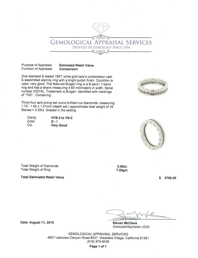 One stamped & tested 18KT white gold lady's combination cast & assembled eternity ring with a bright polish finish. The featured Bulgari ring is a B.zero1 1-band ring and has a shank measuring 4.60 millimeters in width. Serial number 2337AL. Trademark is Bulgari. Identified with markings of "750". Condition is used, very good. Containing: Thirty-Four split prong set round brilliant cut diamonds, measuring 1.70 - 1.65 x 1.01mm (depth est.) approximate. Total Weight of 34 Stones = 0.55ct. Graded in the setting. Clarity: VVS-2 to VS-2. Color: G - I. Cut Very Good. Total Weight of Diamonds 0.55ct. Total Weight of Ring 7.00gm. GAS Appraised at $3,750.00.