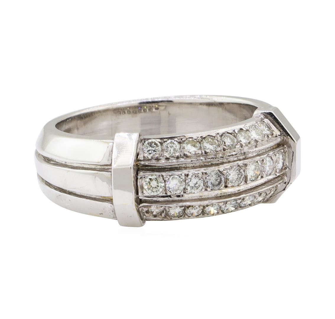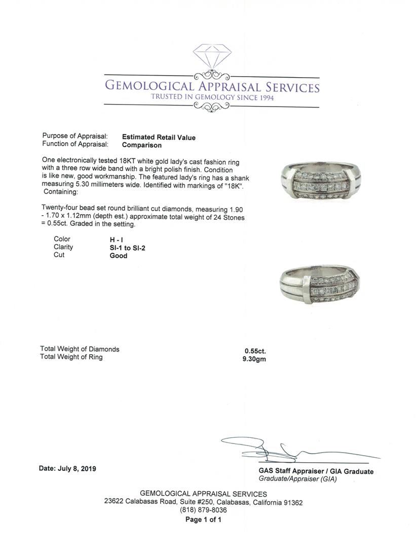 One electronically tested 18KT white gold lady's cast fashion ring with a three row wide band with a bright polish finish. The featured lady's ring has a shank measuring 5.30 millimeters wide. Identified with markings of '18K'. Condition is like new, good workmanship. Containing: Twenty-Four bead set round brilliant cut diamonds, measuring 1.90 - 1.70 x 1.12mm (depth est.) approximate total weight of 24 Stones = 0.55ct. Graded in the setting. Color H - I Clarity SI-1 to SI-2 Cut Good. Total Weight of Diamonds 0.55ct.. Total Weight of Ring 9.30gm GAS Appraised at $3150.00. GAS Appraised.