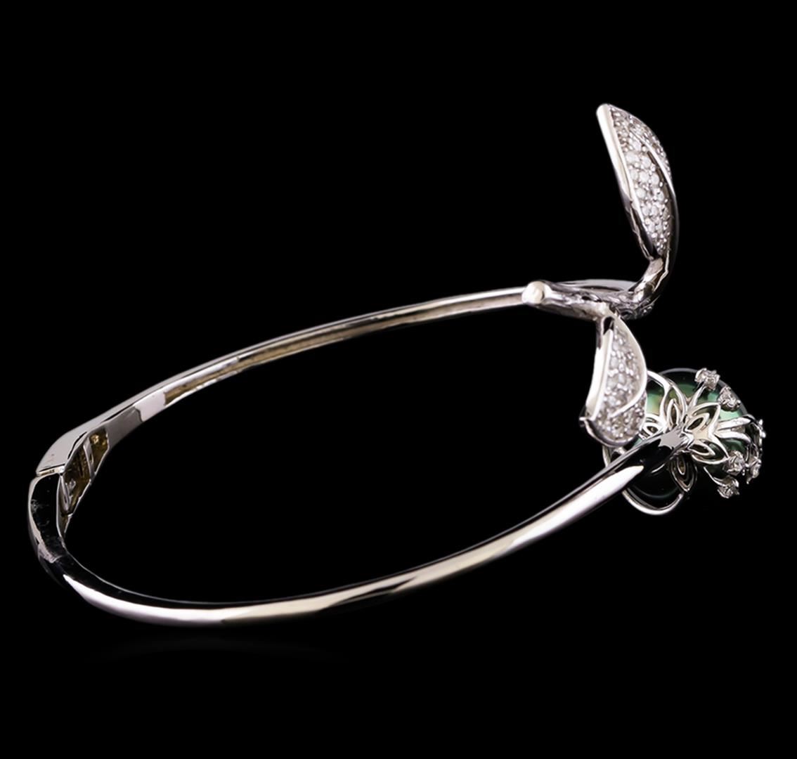 One electronically tested 14KT white gold lady's combination cast & assembled fashion cuff bracelet with a bright polish finish. The featured lady's bracelet has a botanical motif and measures seven inches in length. Identified with markings of 'K14'. Condition is new, good workmanship. Containing: One Tahitian pearl, 11.5mm to 11.3mm in size. The pearl is black in color, green overtone with a very good luster, round to near round, and mostly clean. Graded in the setting. Sixty-Eight prong set round brilliant cut diamonds, measuring 1.30 - 1.25 x 0.79mm (depth est.) approximate total weight of 68 Stones = 0.55ct. Graded in the setting. Clarity SI-1 to SI-2. Color: G - I Cut Good. Total Weight of Diamonds 0.55ct.. Total Weight of Bracelet 13.70gm. GAS Appraised at $5,365.00.