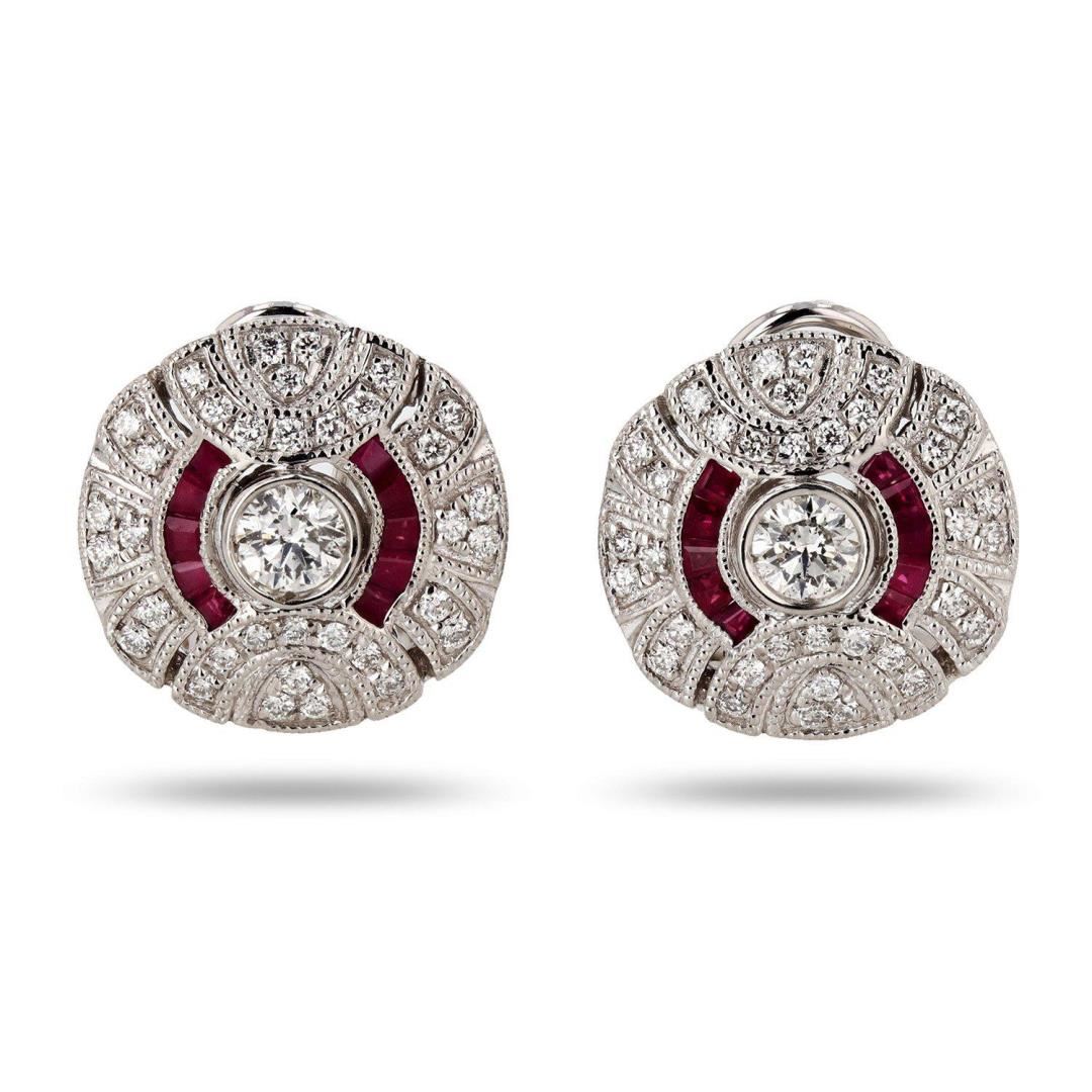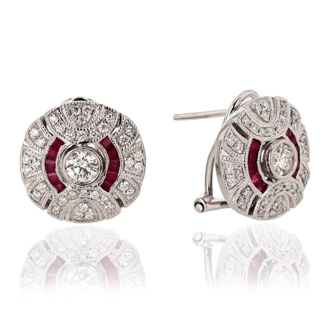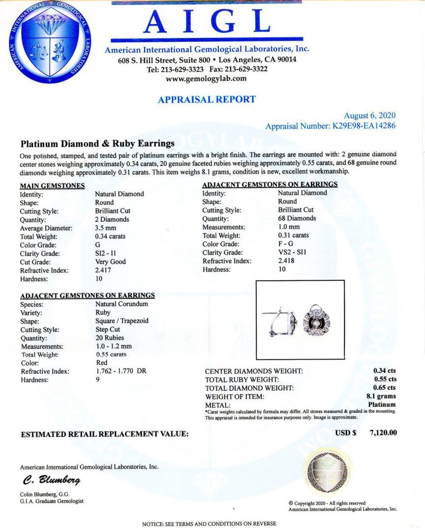 One polished, stamped, and tested pair of platinum earrings with a bright finish. The earrings are mounted with: 2 genuine diamond center stones weighing approximately 0.34 carats, 20 genuine faceted rubies weighing approximately 0.55 carats, and 68 genuine round diamonds weighing approximately 0.31 carats. This item weighs 8.1 grams, condition is new, excellent workmanship. MAIN GEMSTONES Identity: Natural Diamond Shape: Round Cutting Style: Brilliant Cut Quantity: 2 Diamonds Average Diameter: 3.5mm Total Weight: 0.34 carats Color Grade: G Clarity Grade: SI2 to I1 Cut Grade: Very Good Refractive Index: 2.417 Hardness: 10 ADJACENT GEMSTONES ON EARRINGS Identity: Natural Diamond Shape: Round Cutting Style: Brilliant Cut Quantity: 68 Diamonds Measurements: 1.0mm Total Weight: 0.31 carats Color Grade: F - G Clarity Grade: VS2 to SI1 Refractive Index: 2.418 Hardness: 10 ADJACENT GEMSTONES ON EARRINGS Species: Natural Corundum Variety: Ruby Shape: Square / Trapezoid Cutting Style: Step Cut Quantity: 20 Rubies Measurements: 1.0mm to 1.2mm Total Weight: 0 55 carats Color: Red Refractive Index: 1.762 - 1.770 DR Hardness: 9 CENTER DIAMONDS WEIGHT: 0.34 ctw TOTAL RUBY WEIGHT: 0.55 ctw TOTAL DIAMOND WEIGHT: 0.65 ctw WEIGHT OF ITEM: 8.1 grams METAL: Platinum
