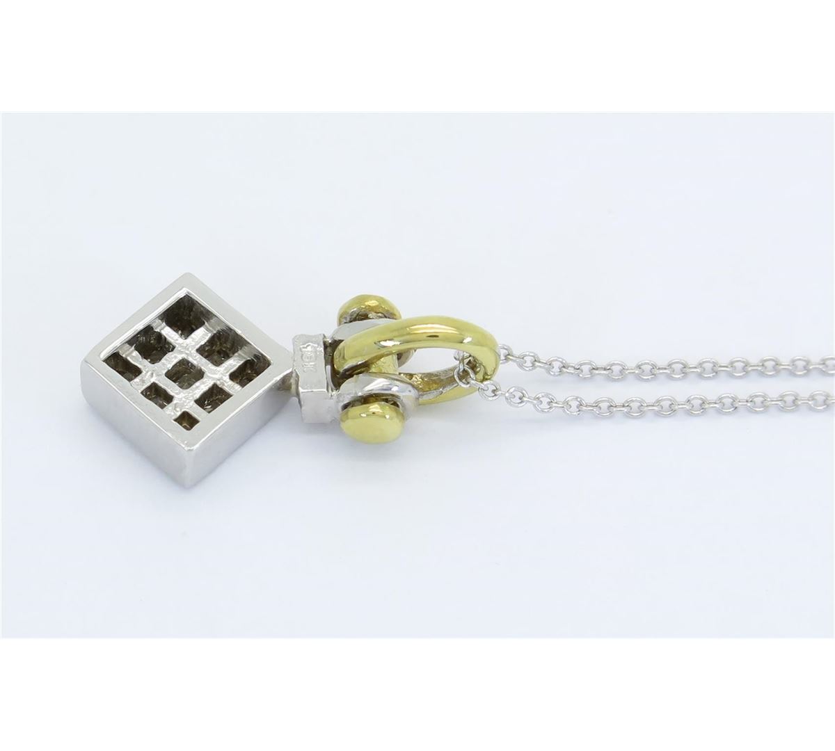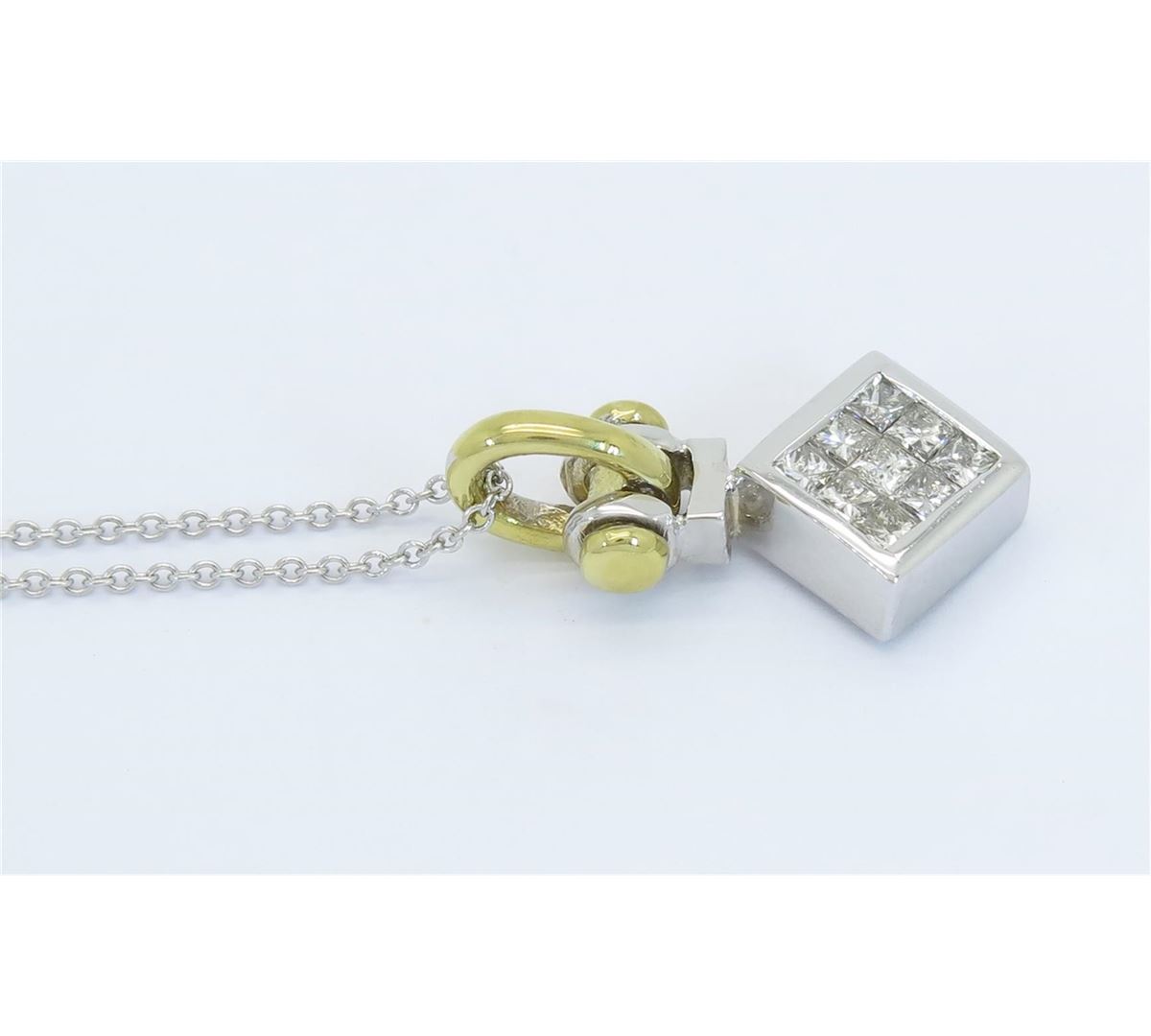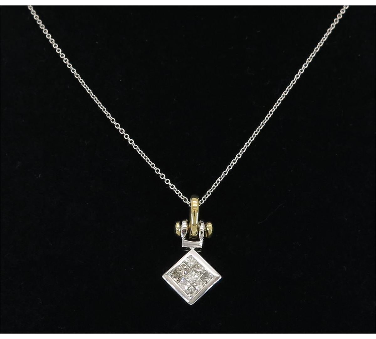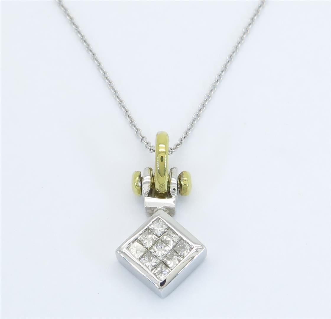 One tested 18K gold diamond pendant. Containing: Nine Princess Cut Diamonds. Clarity: I, Color: I-J. Approximate total diamond weight: .55CTW. Diamonds are graded in the mounting, unless otherwise stated. Weight of pendant: 5.5 grams. Size of chain: 18" l
