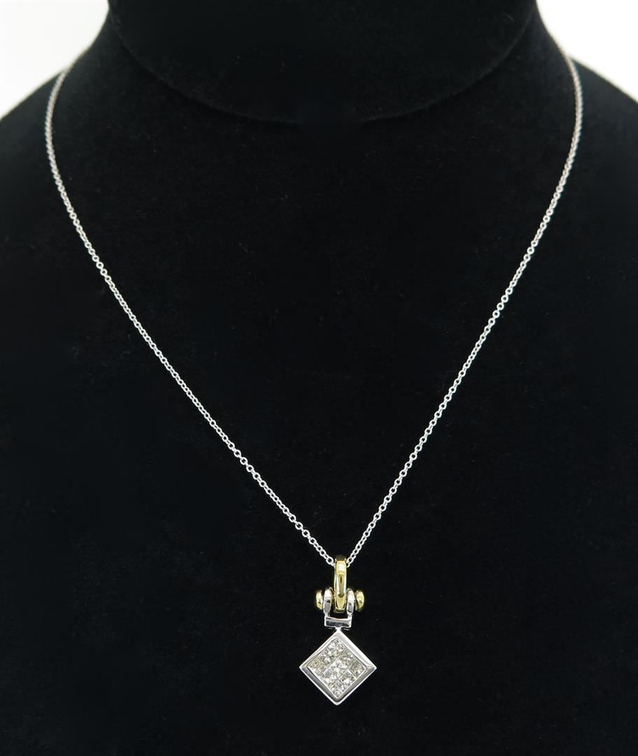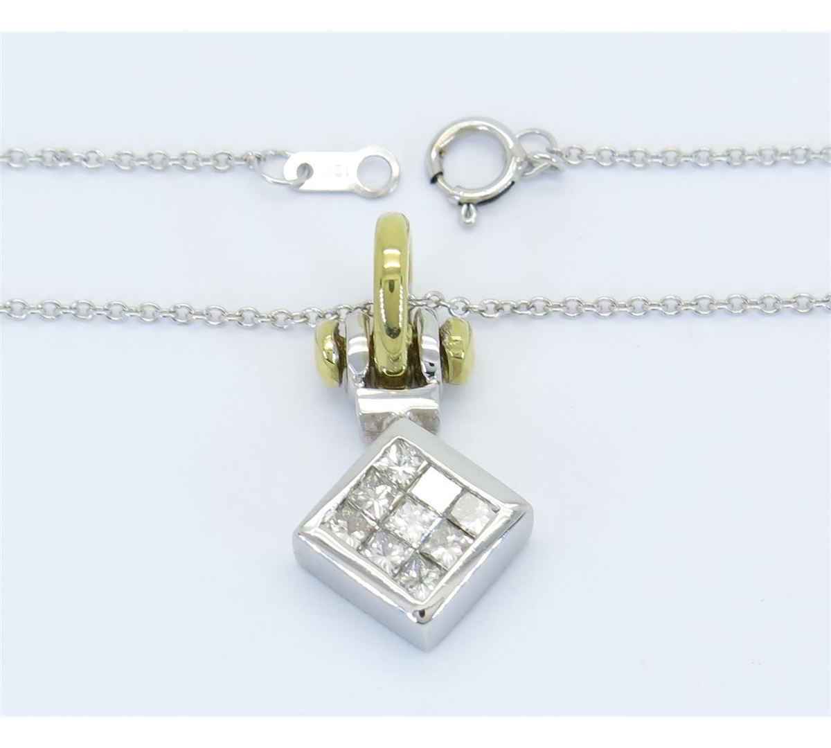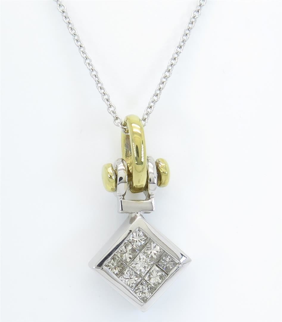 One tested 18K gold diamond pendant. Containing: Nine Princess Cut Diamonds. Clarity: I, Color: I-J. Approximate total diamond weight: .55CTW. Diamonds are graded in the mounting, unless otherwise stated. Weight of pendant: 5.5 grams. Size of chain: 18" long.