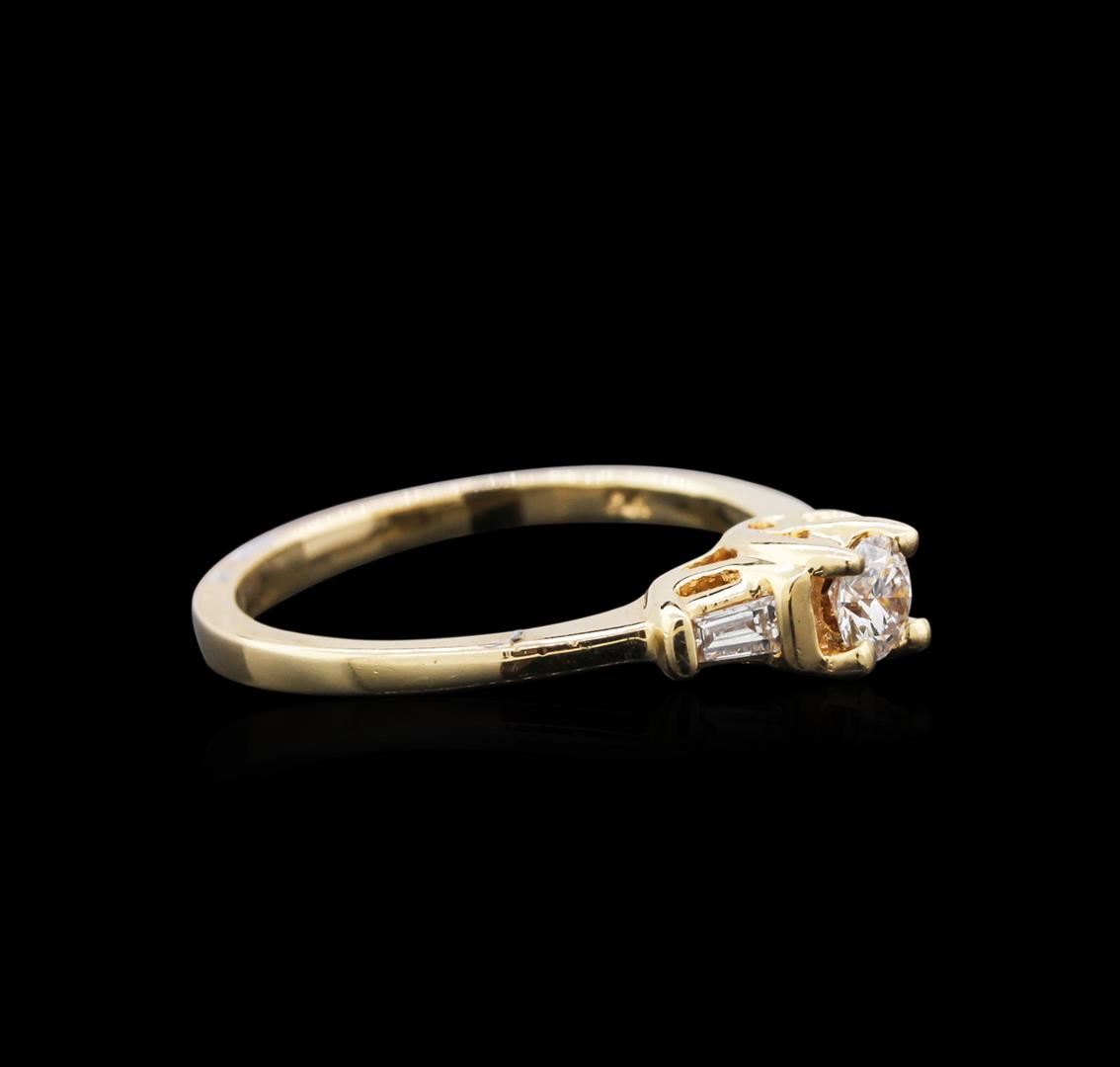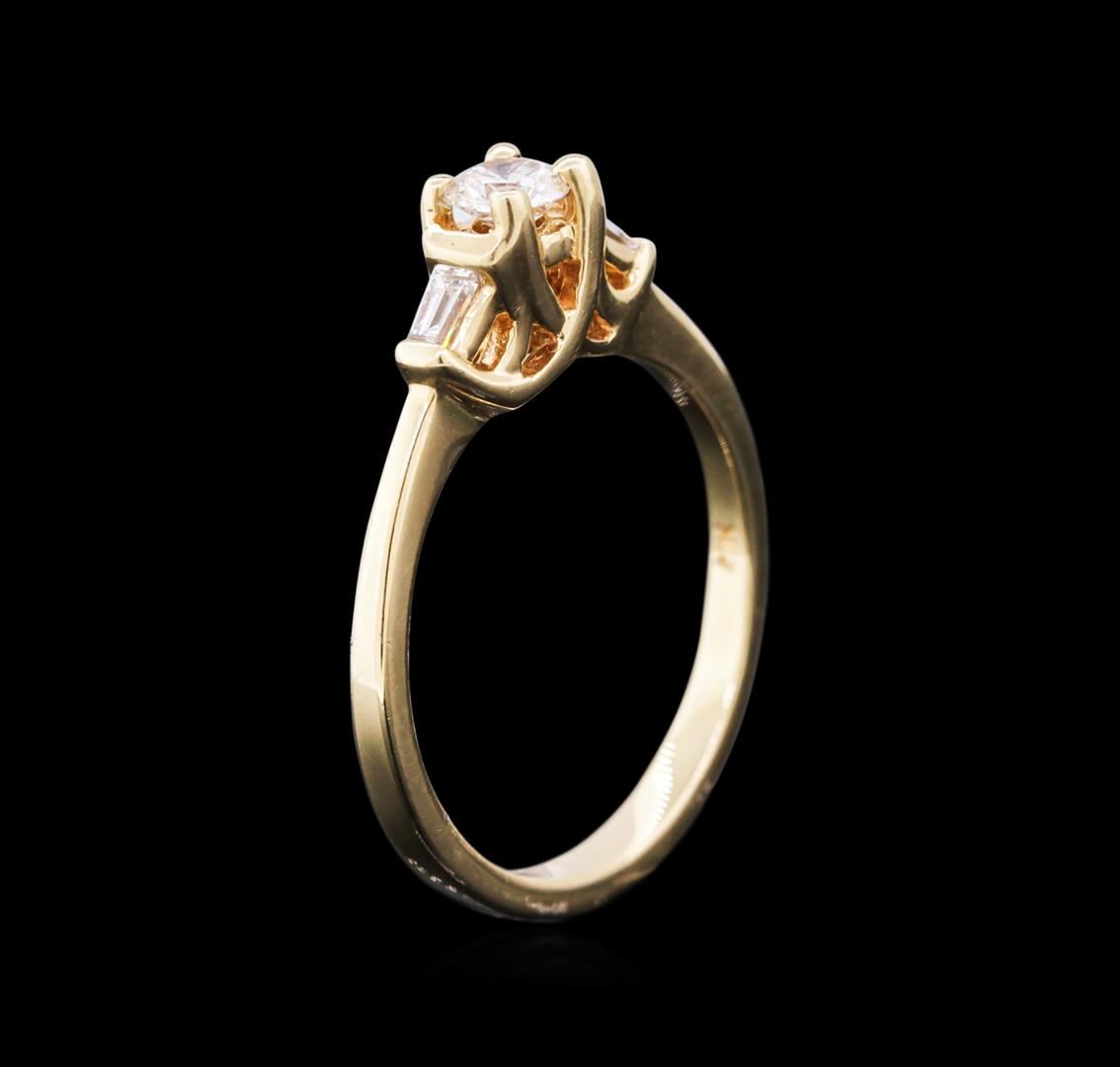 One ring featuring: 14KT yellow gold weighing 2.10 grams containing one diamond center stone with a total weight of 0.20ct and two tapered baguette cut diamonds with a total weight of 0.35ct.