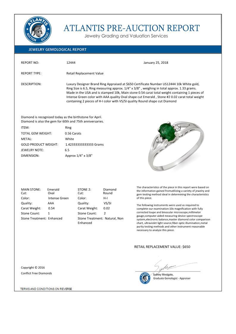 REF-10T2M -12444 ---- 0.56 CTW Emerald & Diamond Ring 10K White Gold ---- Luxury Designer Brand Ring Appraised at $650 Certificate Number US12444 10k White gold, Ring Size is 6.5, Ring measuring approx. 1/4" x 3/8" , weighing in total approx. 1.33 grams. Made in the USA and is stamped 10k, Main stone 0.54 carat total weight containing 1 pieces of Intense Green color with AAA quality Oval shape cut Emerald , Stone #2 0.02 carat total weight containing 2 pieces of H-I color with VS/SI quality Round shape cut Diamond
