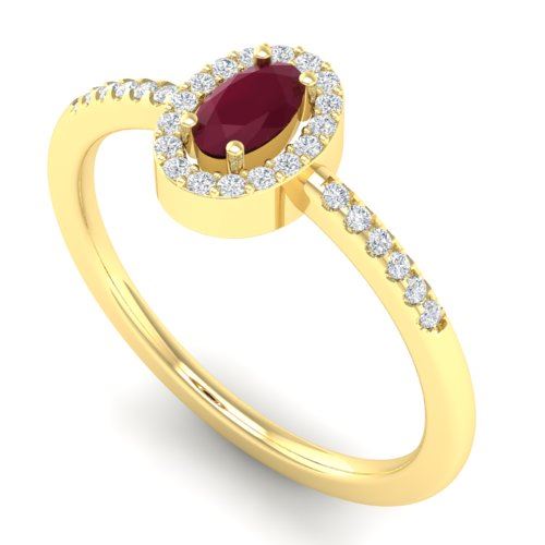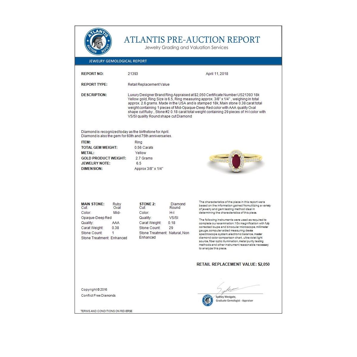 REF-31W3F -21393 ---- 0.56 CTW Ruby & Micro Pave VS/SI Diamond Ring Halo 18K Yellow Gold ---- Luxury Designer Brand Ring Appraised at $2,050 Certificate Number US21393 18k Yellow gold, Ring Size is 6.5, Ring measuring approx. 3/8" x 1/4" , weighing in total approx. 2.6 grams. Made in the USA and is stamped 18k, Main stone 0.38 carat total weight containing 1 pieces of Mid-Opaque-Deep Red color with AAA quality Oval shape cut Ruby , Stone #2 0.18 carat total weight containing 29 pieces of H-I color with VS/SI quality Round shape cut Diamond