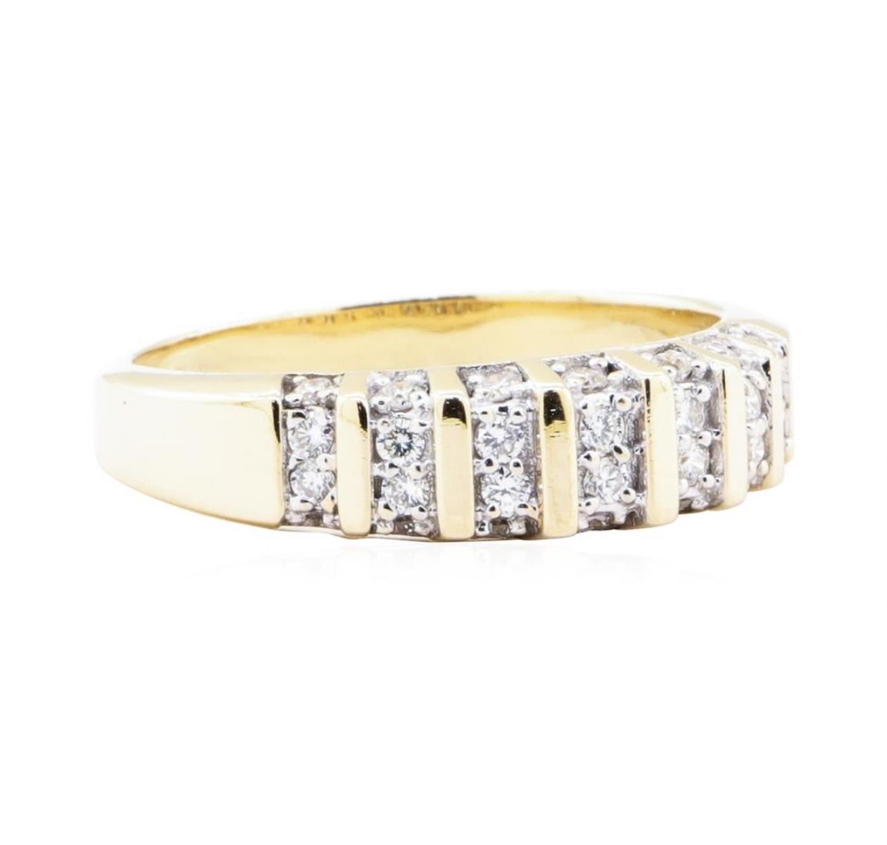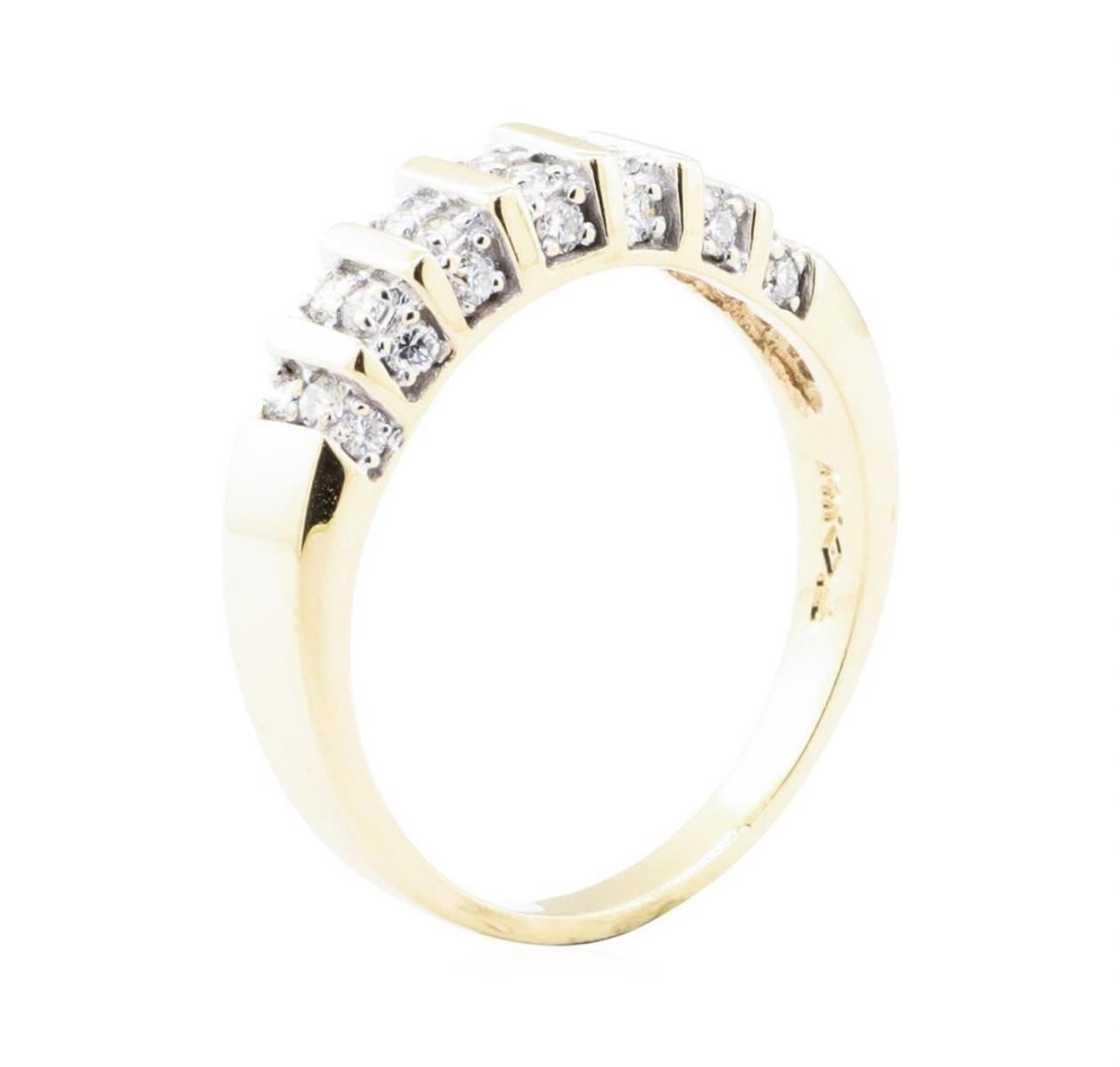 One electronically tested 14KT yellow gold lady's cast fashion cathedral beveled edge band with a bright polish finish. The featured lady's ring has a shank measuring 2.70 millimeters in width. Identified with markings of '14K'. Condition is Good. Contain GAS Appraised.