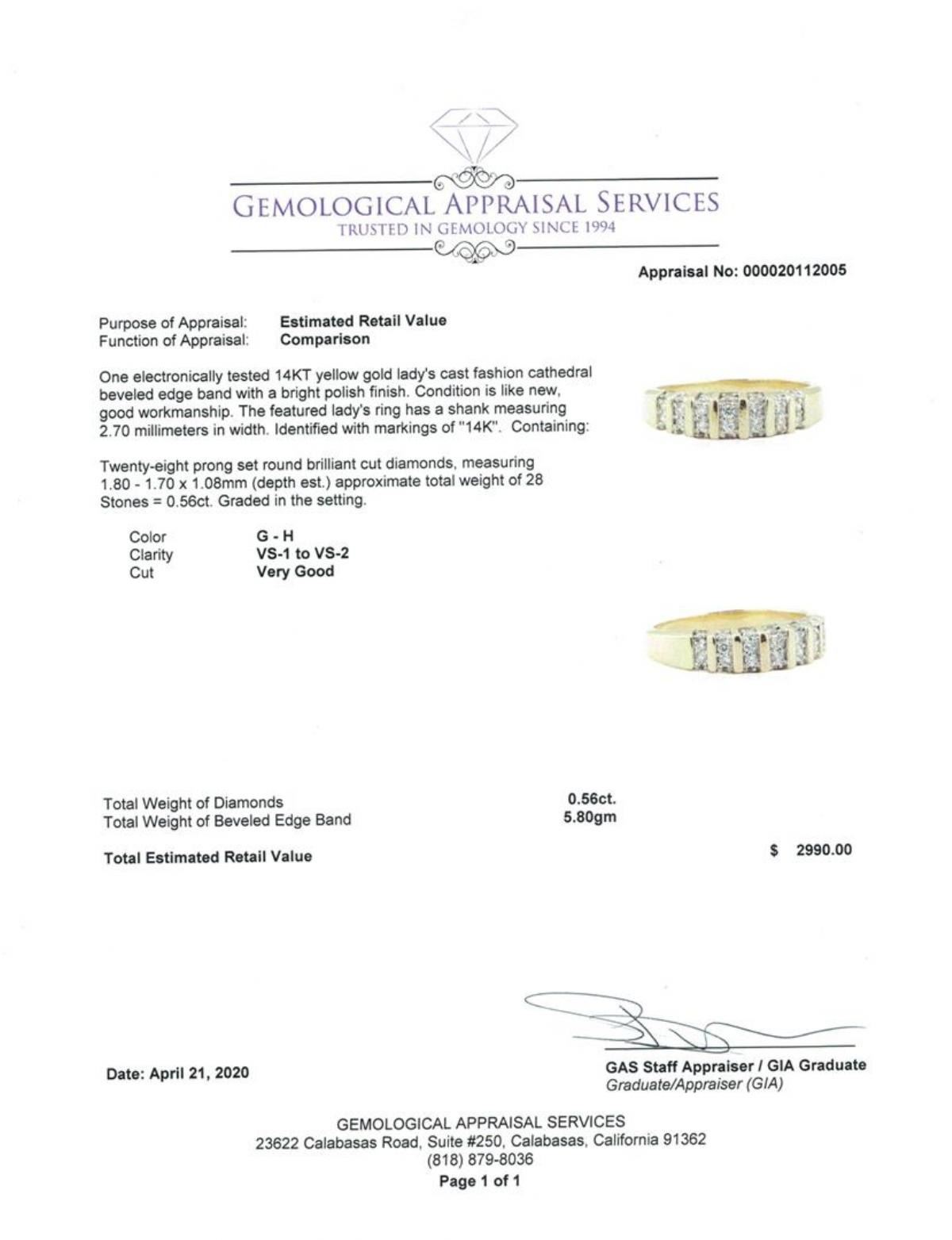One electronically tested 14KT yellow gold lady's cast fashion cathedral beveled edge band with a bright polish finish. The featured lady's ring has a shank measuring 2.70 millimeters in width. Identified with markings of '14K'. Condition is Good. Contain GAS Appraised.