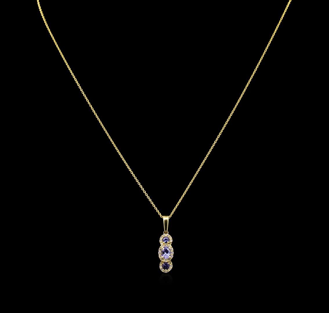 One pendant with chain featuring: 14KT yellow gold weighing 3.40 grams containing three tanzanites with a total weight of 0.56ct and diamonds with a total weight of 0.17ct.
