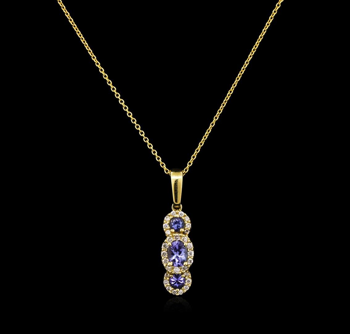 One pendant with chain featuring: 14KT yellow gold weighing 3.40 grams containing three tanzanites with a total weight of 0.56ct and diamonds with a total weight of 0.17ct.
