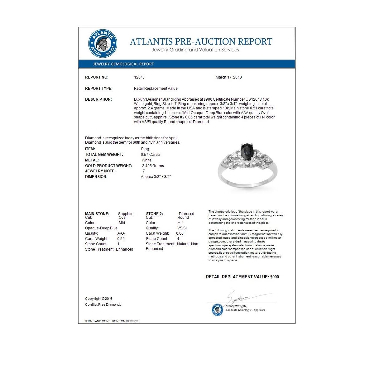 REF-14A8X -12643 ---- 0.57 CTW Blue Sapphire & Diamond Ring 10K White Gold ---- Luxury Designer Brand Ring Appraised at $900 Certificate Number US12643 10k White gold, Ring Size is 7, Ring measuring approx. 3/8" x 3/4" , weighing in total approx. 2.4 grams. Made in the USA and is stamped 10k, Main stone 0.51 carat total weight containing 1 pieces of Mid-Opaque-Deep Blue color with AAA quality Oval shape cut Sapphire , Stone #2 0.06 carat total weight containing 4 pieces of H-I color with VS/SI quality Round shape cut Diamond