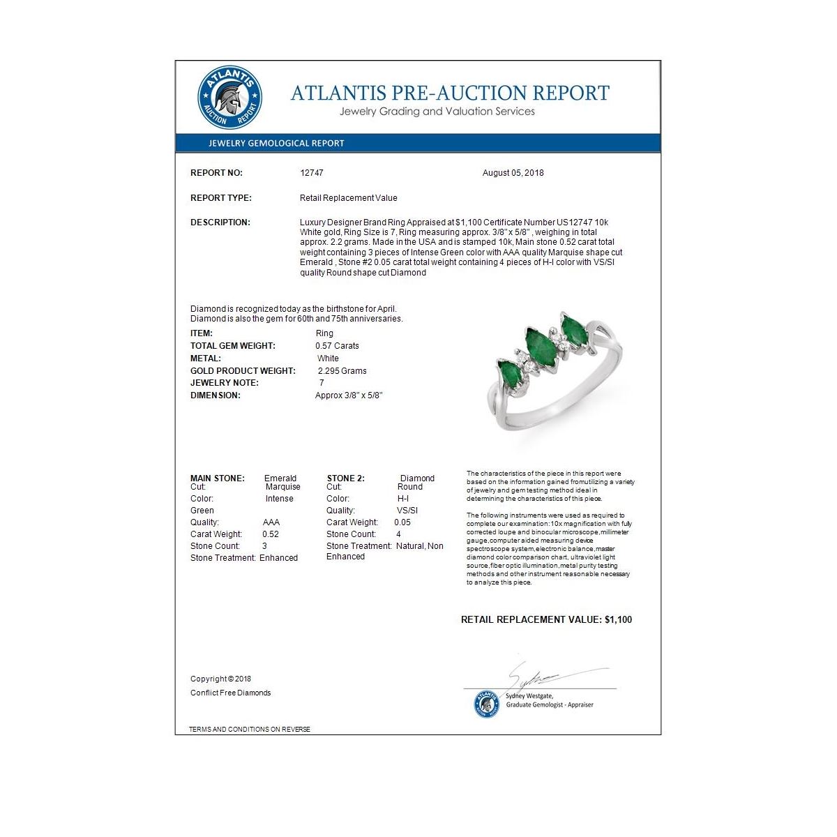 REF-16X4T -12747 ---- 0.57 CTW Emerald & Diamond Ring 10K White Gold ---- Luxury Designer Brand Ring Appraised at $1,100 Certificate Number US12747 10k White gold, Ring Size is 7, Ring measuring approx. 3/8" x 5/8" , weighing in total approx. 2.2 grams. Made in the USA and is stamped 10k, Main stone 0.52 carat total weight containing 3 pieces of Intense Green color with AAA quality Marquise shape cut Emerald , Stone #2 0.05 carat total weight containing 4 pieces of H-I color with VS/SI quality Round shape cut Diamond