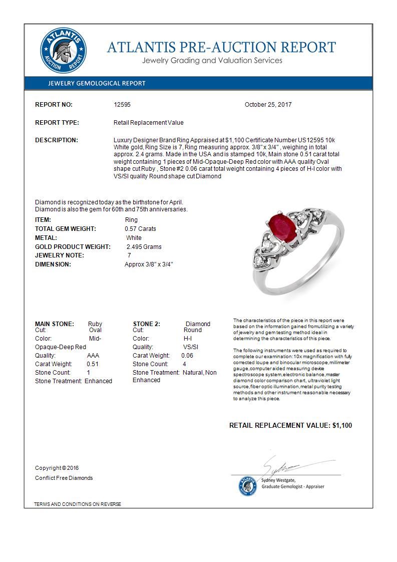 REF-16A4X -12595 ---- 0.57 CTW Ruby & Diamond Ring 10K White Gold ---- Luxury Designer Brand Ring Appraised at $1,100 Certificate Number US12595 10k White gold, Ring Size is 7, Ring measuring approx. 3/8" x 3/4" , weighing in total approx. 2.4 grams. Made in the USA and is stamped 10k, Main stone 0.51 carat total weight containing 1 pieces of Mid-Opaque-Deep Red color with AAA quality Oval shape cut Ruby , Stone #2 0.06 carat total weight containing 4 pieces of H-I color with VS/SI quality Round shape cut Diamond