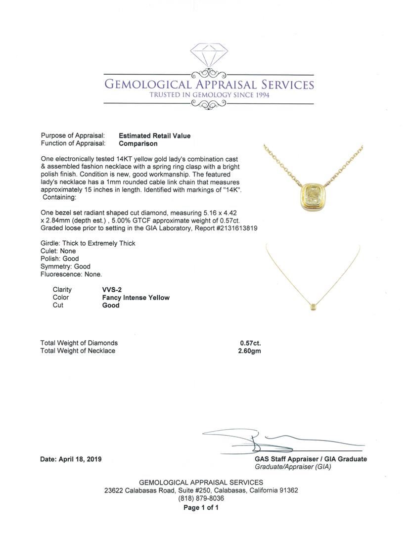 One electronically tested 14KT yellow gold lady's combination cast & assembled fashion necklace with a spring ring clasp with a bright polish finish. The featured lady's necklace has a 1mm rounded cable link chain that measures approximately 15 inches in length. Identified with markings of '14K'. Condition is new, good workmanship. Containing: One bezel set radiant shaped cut diamond, measuring 5.16 x 4.42 x 2.84mm (depth est.) , 5.00.%. GTCF approximate weight of 0.57ct. Graded loose prior to setting in the GIA Laboratory, Report #2131613819Girdle: Thick to Extremely ThickCulet: NonePolish: GoodSymmetry: GoodFluorescence: None. Color Fancy Intense Yellow Clarity VVS-2 Cut Good. Total Weight of Diamonds 0.57ct.. Total Weight of Necklace 2.60gm GAS Appraised at $8930.00. GAS Appraised at $12,570.00.