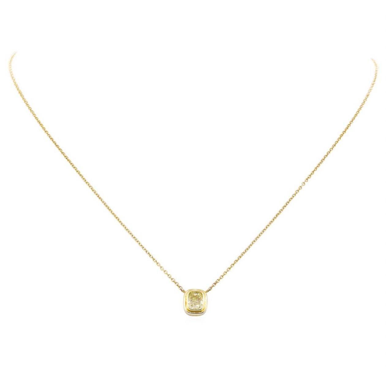 One electronically tested 14KT yellow gold lady's combination cast & assembled fashion necklace with a spring ring clasp with a bright polish finish. The featured lady's necklace has a 1mm rounded cable link chain that measures approximately 15 inches in length. Identified with markings of '14K'. Condition is new, good workmanship. Containing: One bezel set radiant shaped cut diamond, measuring 5.16 x 4.42 x 2.84mm (depth est.) , 5.00.%. GTCF approximate weight of 0.57ct. Graded loose prior to setting in the GIA Laboratory, Report #2131613819Girdle: Thick to Extremely ThickCulet: NonePolish: GoodSymmetry: GoodFluorescence: None. Color Fancy Intense Yellow Clarity VVS-2 Cut Good. Total Weight of Diamonds 0.57ct.. Total Weight of Necklace 2.60gm GAS Appraised at $8930.00. GAS Appraised at $12,570.00.