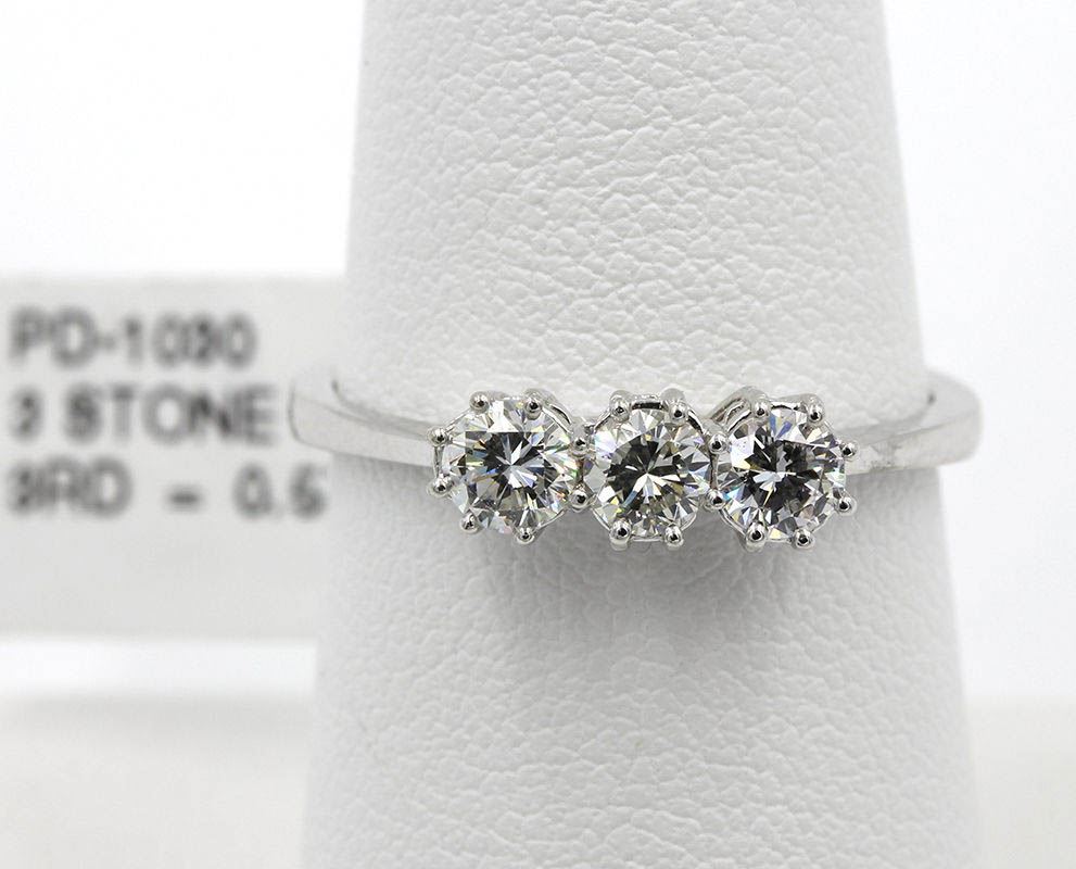 One lady's three stone ring featuring: 14KT white gold weighing 1.41 grams containing three diamonds weighing 0.57ctw. The diamonds are round brilliant cut with VS1 clarity, G-H color and very good cut. The ring is a size 6.75 but can be resized.