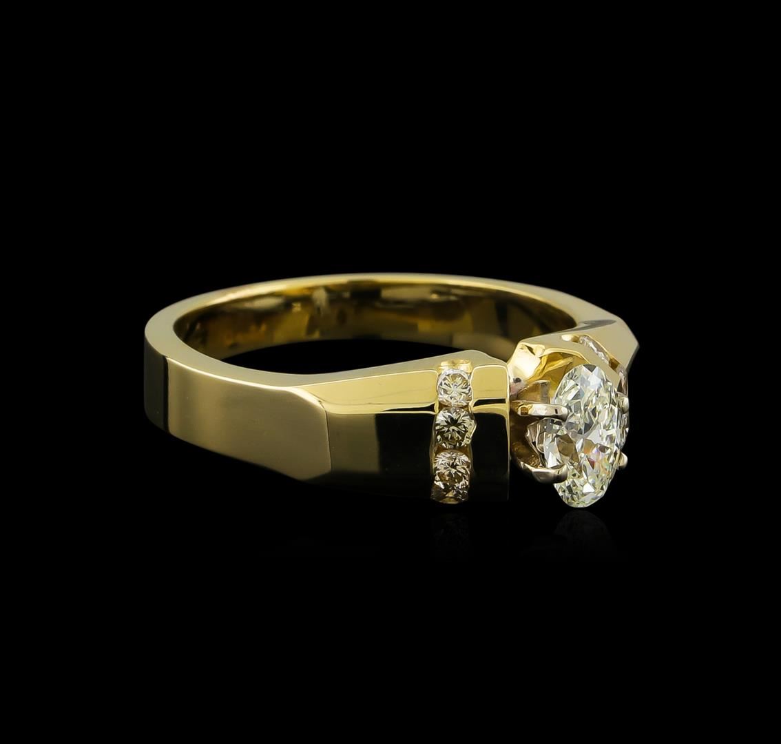 One electronically tested 14KT yellow gold lady's cast wedding ring with a bright polish finish. The featured lady's ring has a shank measuring 3.12 millimeters wide. Identified with markings of "14K". Condition is new, good workmanship. Containing: One prong set oval shaped cut diamond, measuring 6.27 x 4.34 x 2.73mm (depth est.) approximate weight of 0.49ct. Graded in the setting. Clarity: SI-1. Color: L - M. Cut Good Eight channel set round brilliant cut diamonds, measuring 1.90 - 1.80 x 1.11mm (depth est.) approximate total weight of 8 Stones = 0.18ct. Graded in the setting. Clarity: VS-2 to SI-1. Color: H - Very Good. Total Weight of Diamonds 0.67ct. Total Weight of Ring 6.70gm GAS Appraised at $3,400.00.