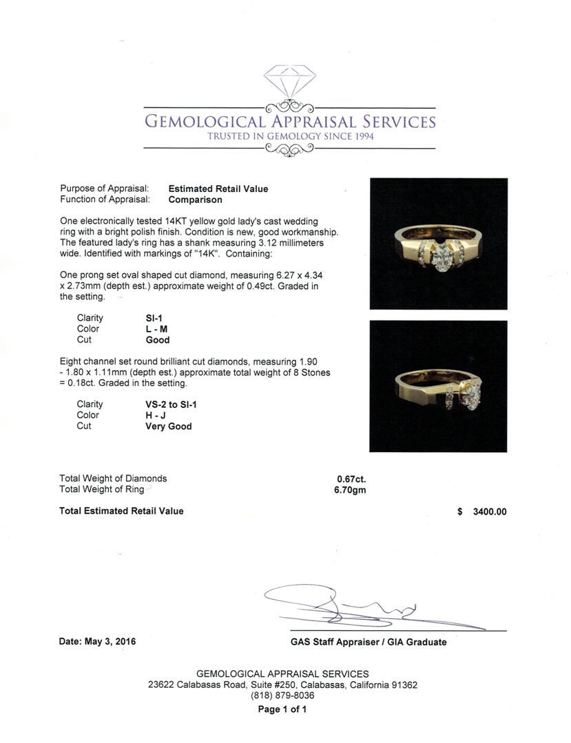 One electronically tested 14KT yellow gold lady's cast wedding ring with a bright polish finish. The featured lady's ring has a shank measuring 3.12 millimeters wide. Identified with markings of "14K". Condition is new, good workmanship. Containing: One prong set oval shaped cut diamond, measuring 6.27 x 4.34 x 2.73mm (depth est.) approximate weight of 0.49ct. Graded in the setting. Clarity: SI-1. Color: L - M. Cut Good Eight channel set round brilliant cut diamonds, measuring 1.90 - 1.80 x 1.11mm (depth est.) approximate total weight of 8 Stones = 0.18ct. Graded in the setting. Clarity: VS-2 to SI-1. Color: H - Very Good. Total Weight of Diamonds 0.67ct. Total Weight of Ring 6.70gm GAS Appraised at $3,400.00.