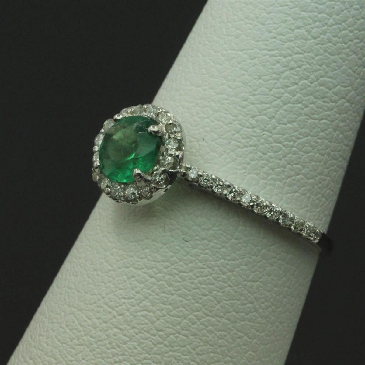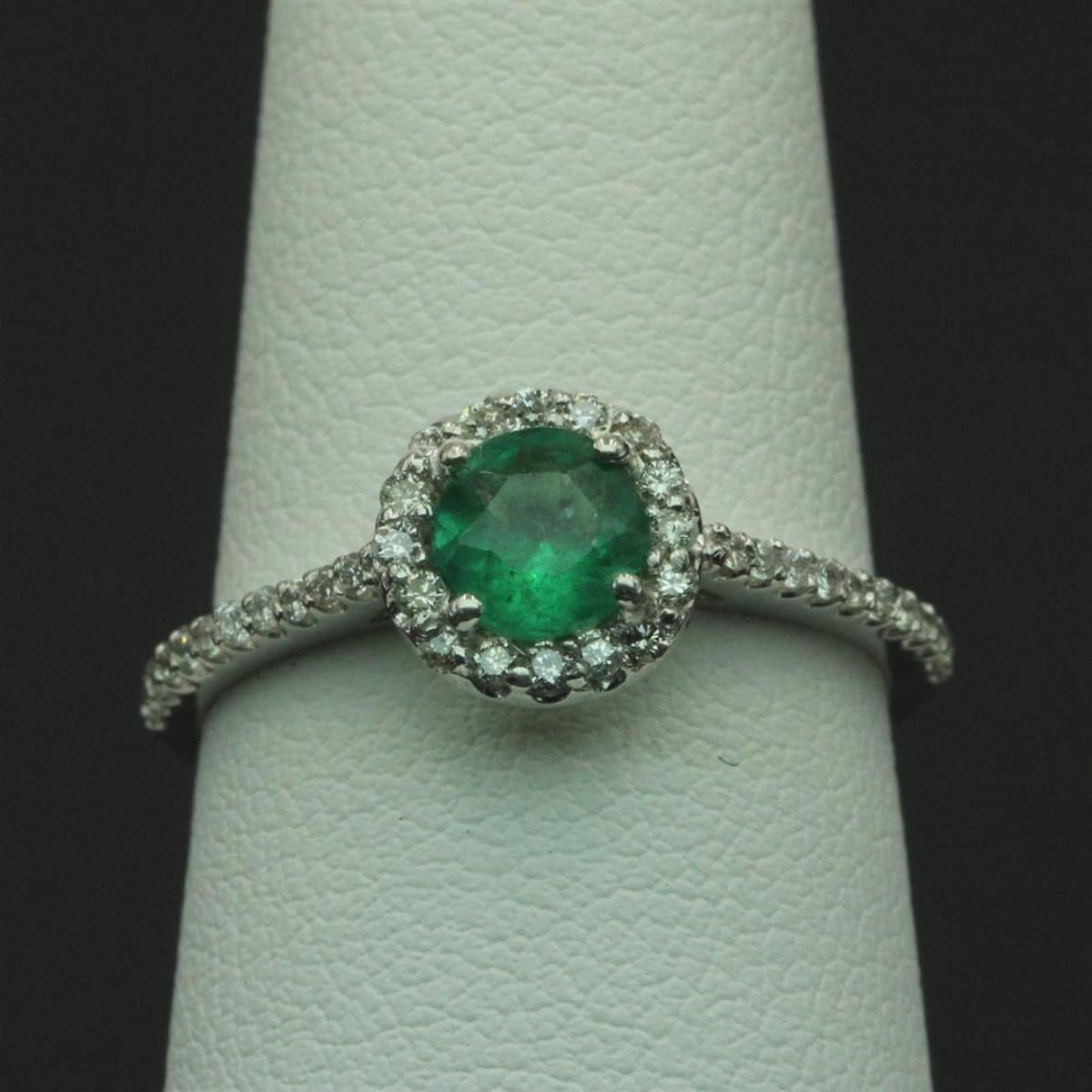 One lady's ring featuring: 14KT white gold weighing 1.75 grams containing one emerald weighing 0.57ct and 38 side diamonds weighing 0.21ctw. The emerald is round brilliant cut with good clarity and excellent cut. The diamonds are round cut, natural, unenhanced stones with SI1 clarity, G color and good cut. The ring is a size 6.25 but can be resized.