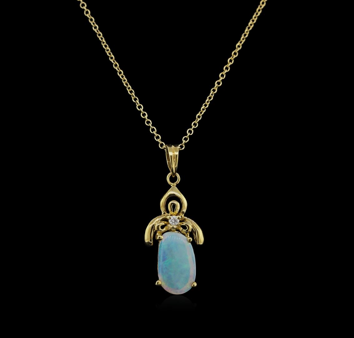 One pendant with chain featuring: 14KT yellow gold weighing 0.94 grams containing one prong set oval cut opal center stone with a total weight of 0.57ct and one prong set round diamond with a total weight of 0.02ct.