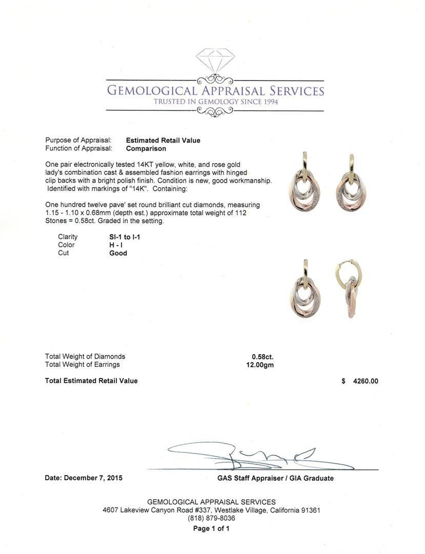 One pair electronically tested 14KT yellow, white, and rose gold lady's combination cast & assembled fashion earrings with hinged clip backs with a bright polish finish. Identified with markings of "14K". Condition is new, good workmanship. Containing: One Hundred Twelve pave' set round brilliant cut diamonds, measuring 1.15 - 1.10 x 0.68mm (depth est.) approximate total weight of 112 Stones = 0.58ct. Graded in the setting. Clarity: SI-1 to I-1. Color: H - I. Cut Good. Total Weight of Diamonds 0.58ct. Total Weight of Earrings 12.00gm. GAS Appraised.