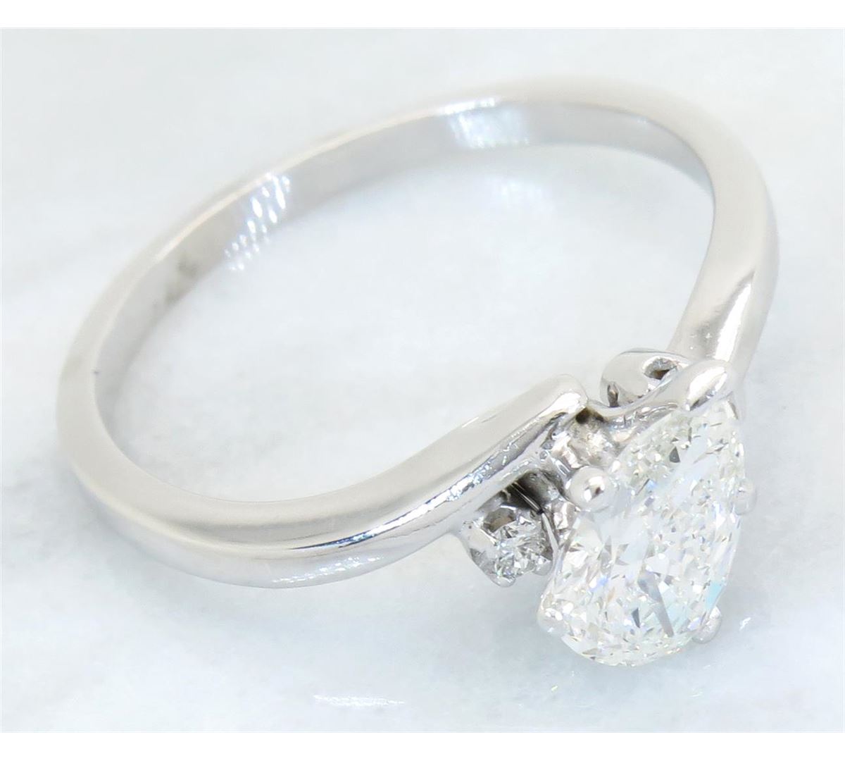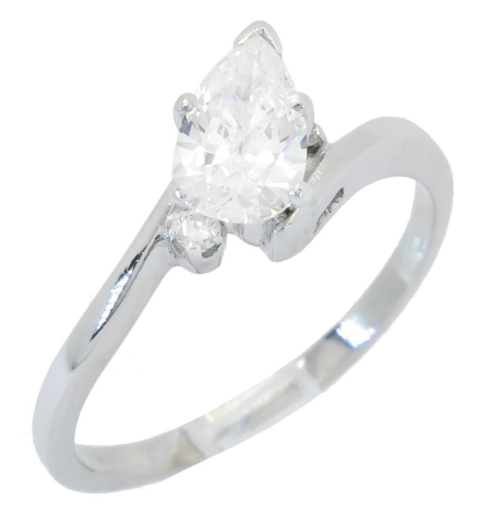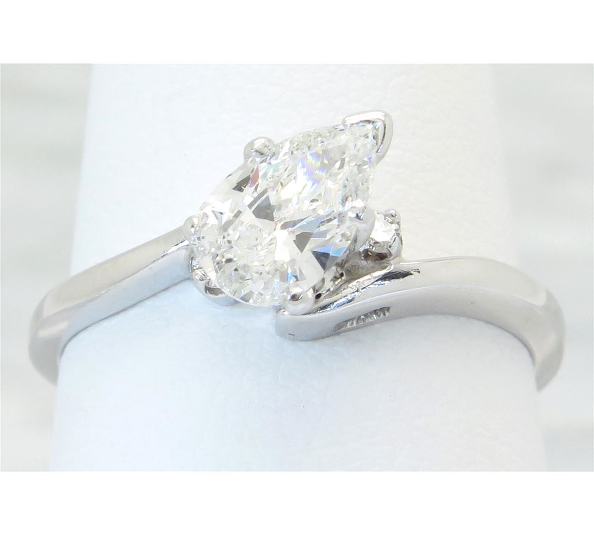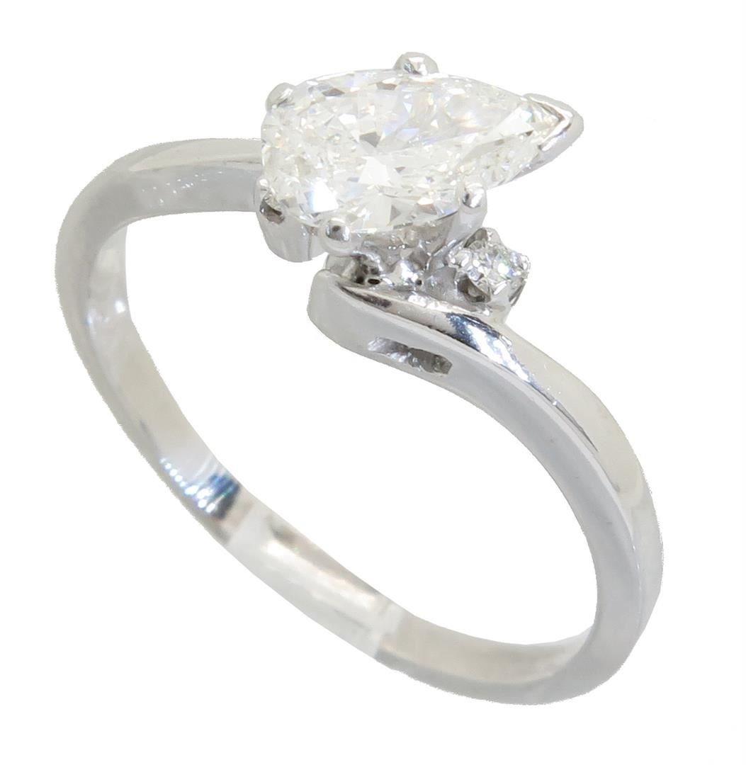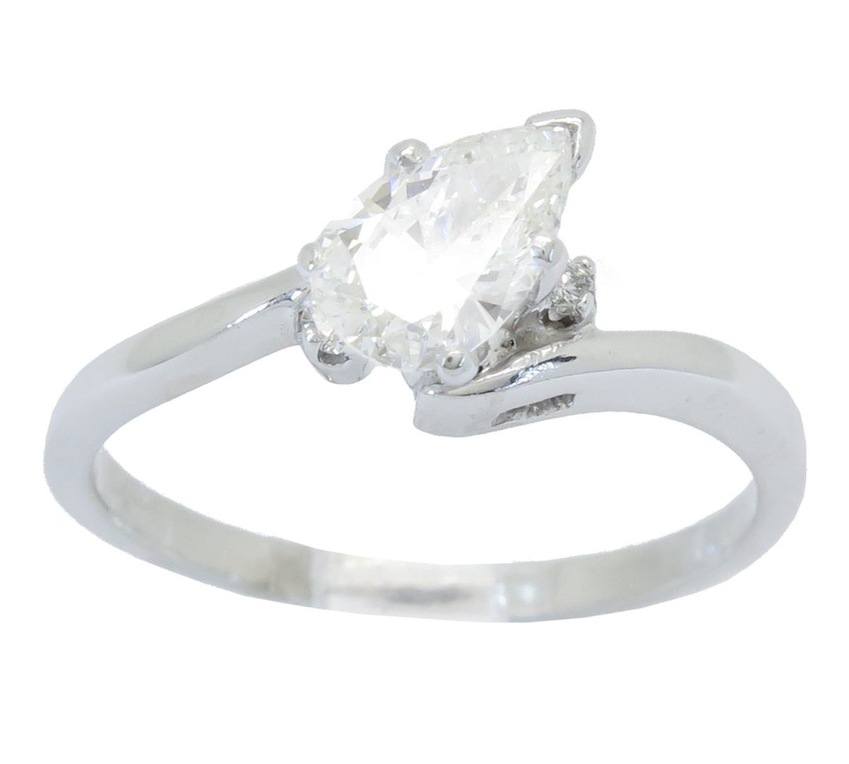 One tested 14K white gold diamond ring. Containing: One Pear Cut Diamond. Approximate size: .58CT, Clarity: SI, Color: F-G. All diamonds are graded in the mounting unless otherwise stated. Weight of ring: 2.3 grams, Size: 6.0.