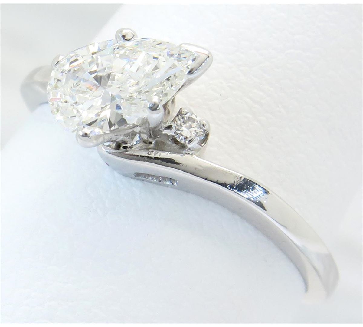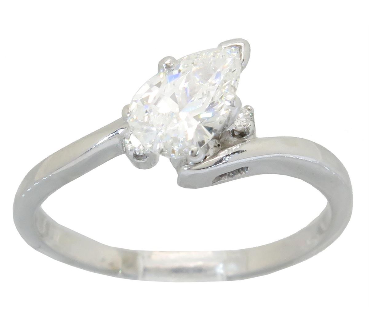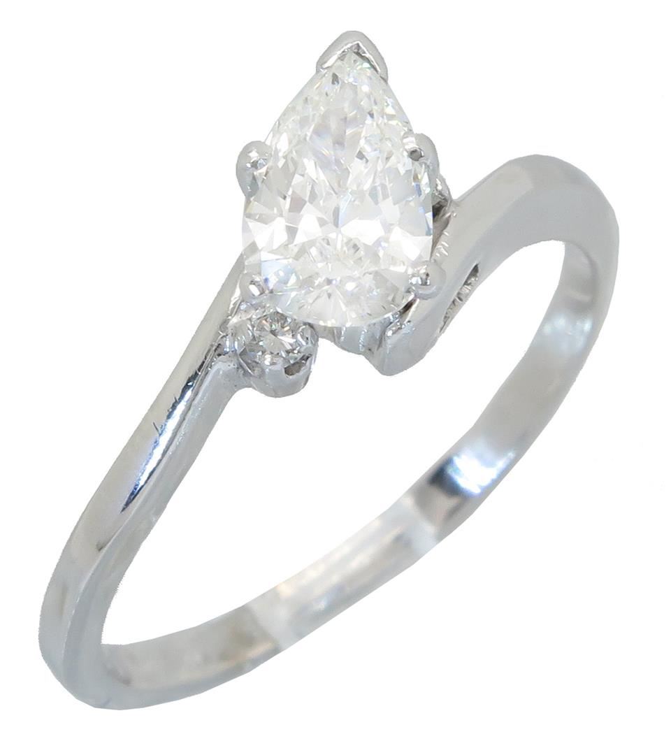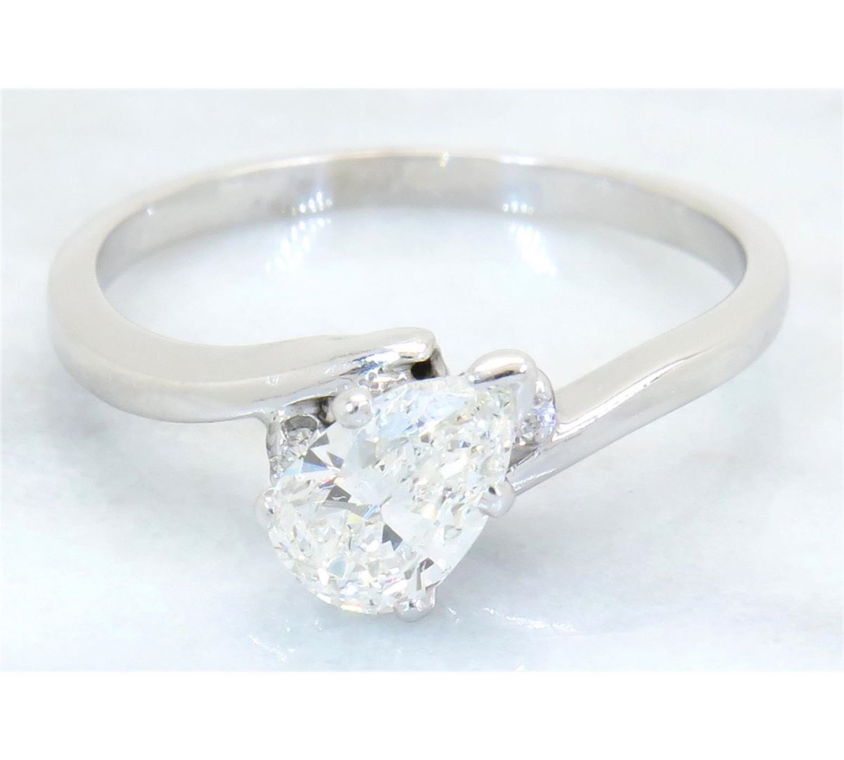 One tested 14K white gold diamond ring. Containing: One Pear Cut Diamond. Approximate size: .58CT, Clarity: SI, Color: F-G. All diamonds are graded in the mounting unless otherwise stated. Weight of ring: 2.3 grams, Size: 6.0.