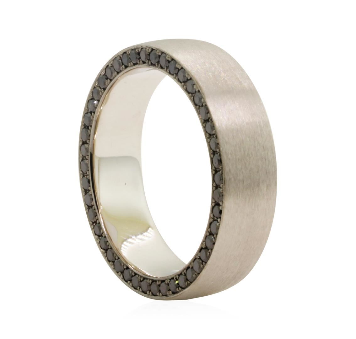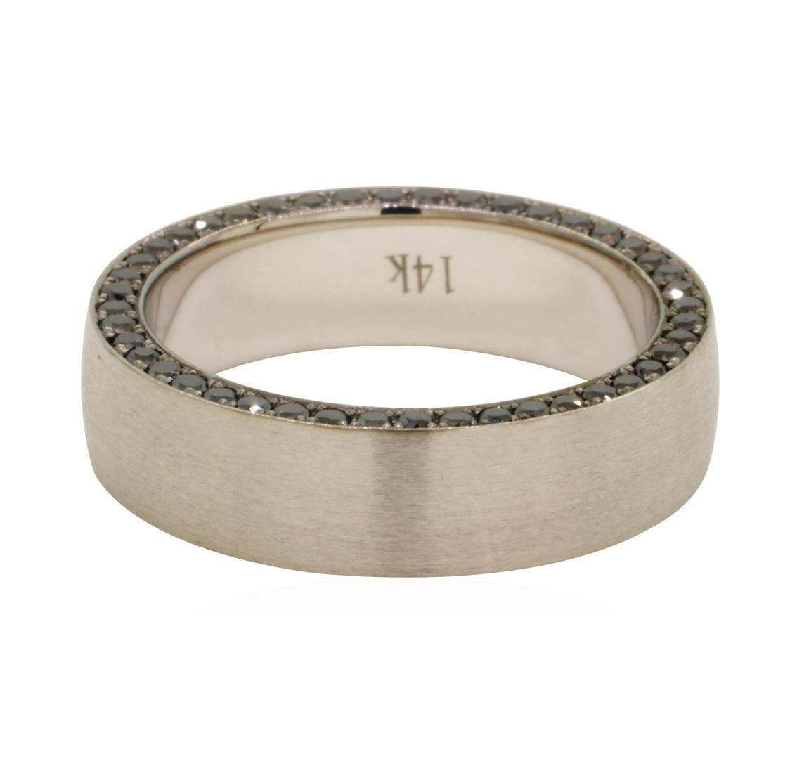 One electronically tested 14KT white gold man's cast fashion ring with a wide band with a brushed finish. This featured men's ring has a shank measuring 6.21 millimeters in width that is set with black diamonds on one side. Identified with markings of '14K'. Condition is new, good workmanship. Containing: Forty-Three prong set round brilliant cut treated diamonds, measuring 1.50 - 1.45 x 0.95mm (depth est.) approximate total weight of 43 Stones = 0.58ct. Colored gemstones are presumed to have been subjected to commonly used enhancement processes. Graded in the setting. Color Fancy Black Cut Good. Total Weight of Diamonds 0.58ct.. Total Weight of Ring 11.90gm GAS Appraised at $2800.00. GAS Appraised.