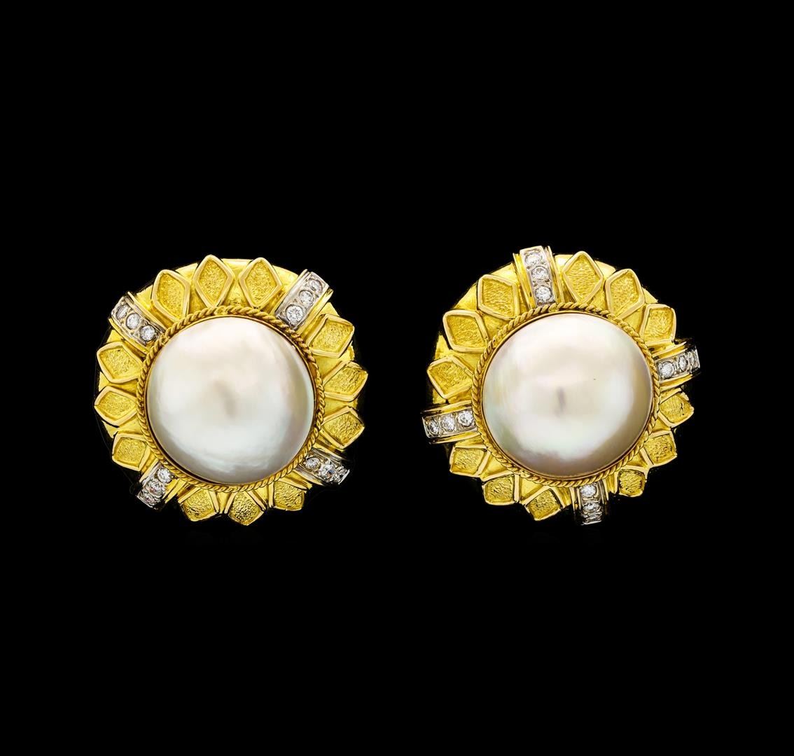 One pair electronically tested 18KT yellow gold lady's hand fabricated fashion dome style earrings with Omega clip backs with posts with a bright polish and satin finish. Condition is used, good workmanship. Containing: Two mabe pearls, 18.7mm to 17.9mm in size. The pearls are white in color, ros� overtone with a good luster, round dome, and lightly blemished with excellent matching. Graded in the setting. Twenty-Four bead set round brilliant cut diamonds, measuring 1.90 - 1.80 x 1.15mm (depth est.) approximate total weight of 24 Stones = 0.58ct. Graded in the setting. Color H - I Clarity VS-2 to SI-1 Cut Good. Total Weight of Diamonds 0.58ct.. Total Weight of Earrings 31.30gm. GAS Appraised.
