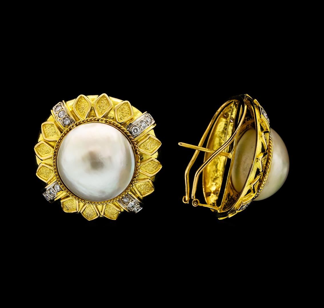 One pair electronically tested 18KT yellow gold lady's hand fabricated fashion dome style earrings with Omega clip backs with posts with a bright polish and satin finish. Condition is used, good workmanship. Containing: Two mabe pearls, 18.7mm to 17.9mm in size. The pearls are white in color, ros� overtone with a good luster, round dome, and lightly blemished with excellent matching. Graded in the setting. Twenty-Four bead set round brilliant cut diamonds, measuring 1.90 - 1.80 x 1.15mm (depth est.) approximate total weight of 24 Stones = 0.58ct. Graded in the setting. Color H - I Clarity VS-2 to SI-1 Cut Good. Total Weight of Diamonds 0.58ct.. Total Weight of Earrings 31.30gm. GAS Appraised.