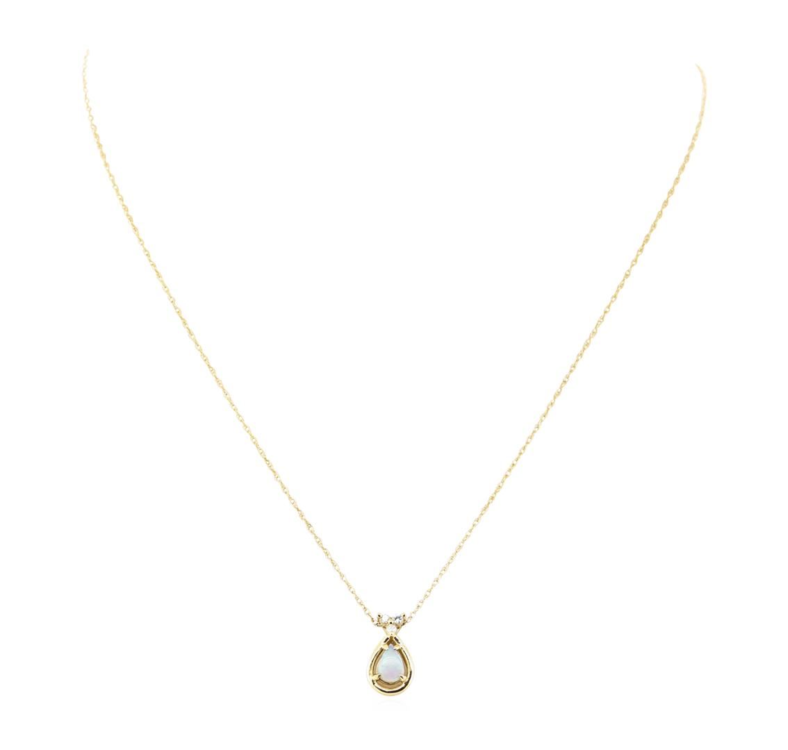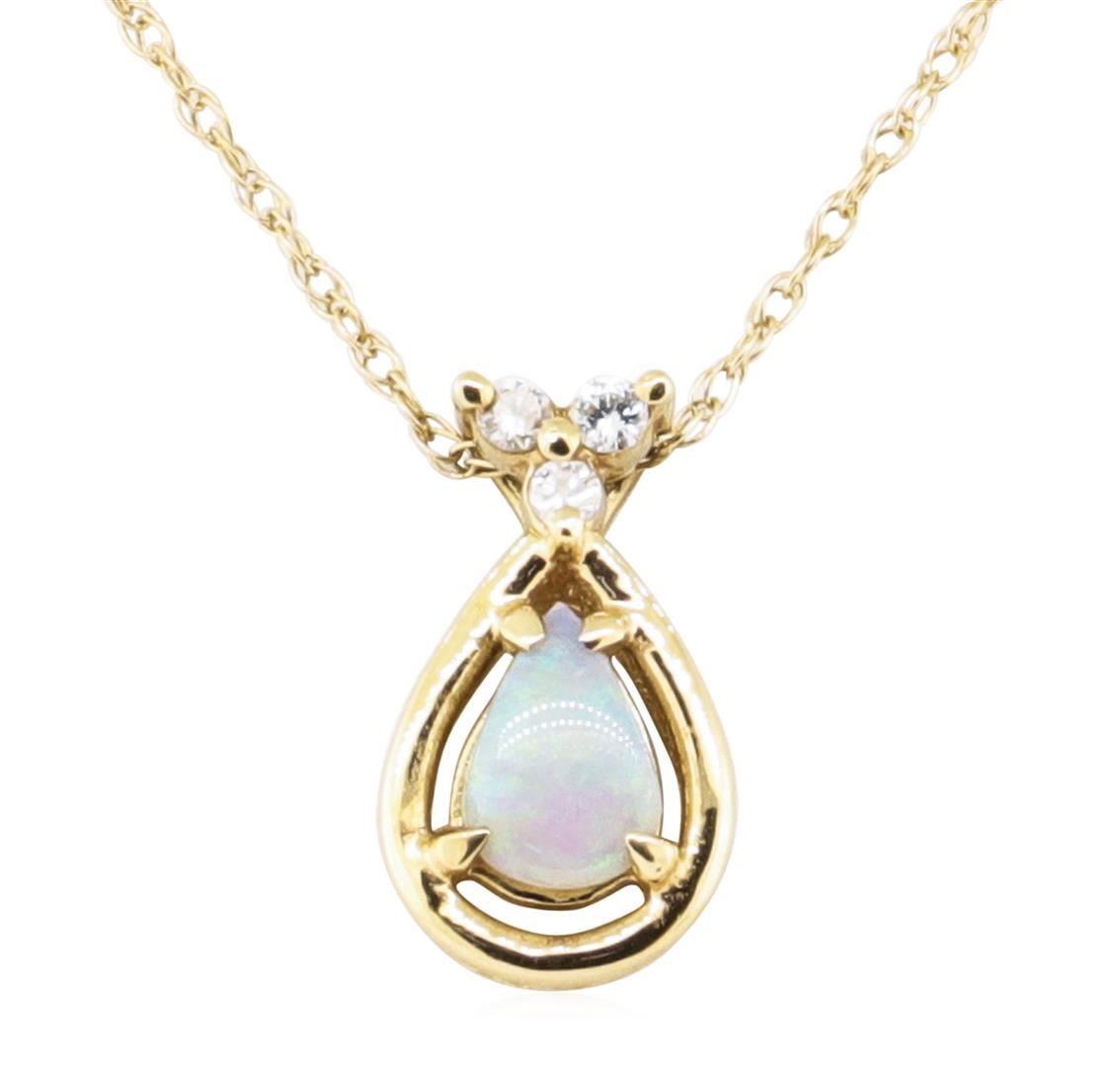 One drop shaped pendant with an attached eighteen inch long loose rope chain featuring: 14KT yellow gold weighing 2.0 grams containing one opal weighing 0.50ct and diamonds weighing 0.08ctw.